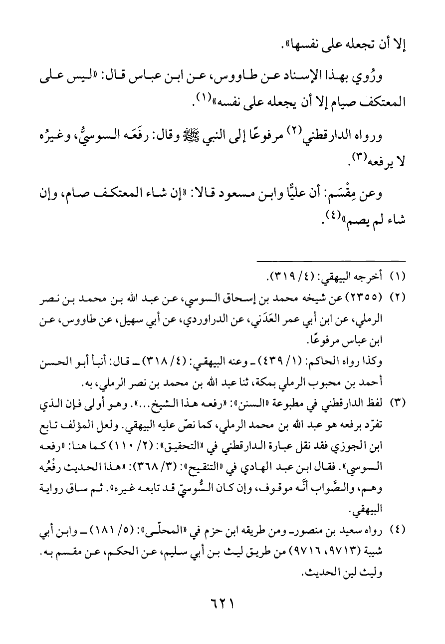 (¬٣) لفظ الدارقطني في مطبوعة «السنن»: «رفعه هذا الشيخ ... ». وهو أولى فإن الذي تفرّد برفعه هو عبد الله بن محمد الرملي، كما نصّ عليه البيهقي. ولعل المؤلف تابع ابن الجوزي فقد نقل عبارة الدارقطني في «التحقيق»: (٢/ ١١٠) كما هنا: «رفعه السوسي». فقال ابن عبد الهادي في «التنقيح»: (٣/ ٣٦٨): «هذا الحديث رفْعُه وهم، والصَّواب أنَّه موقوف، وإن كان السُّوسيّ قد تابعه غيره». ثم ساق رواية البيهقي.