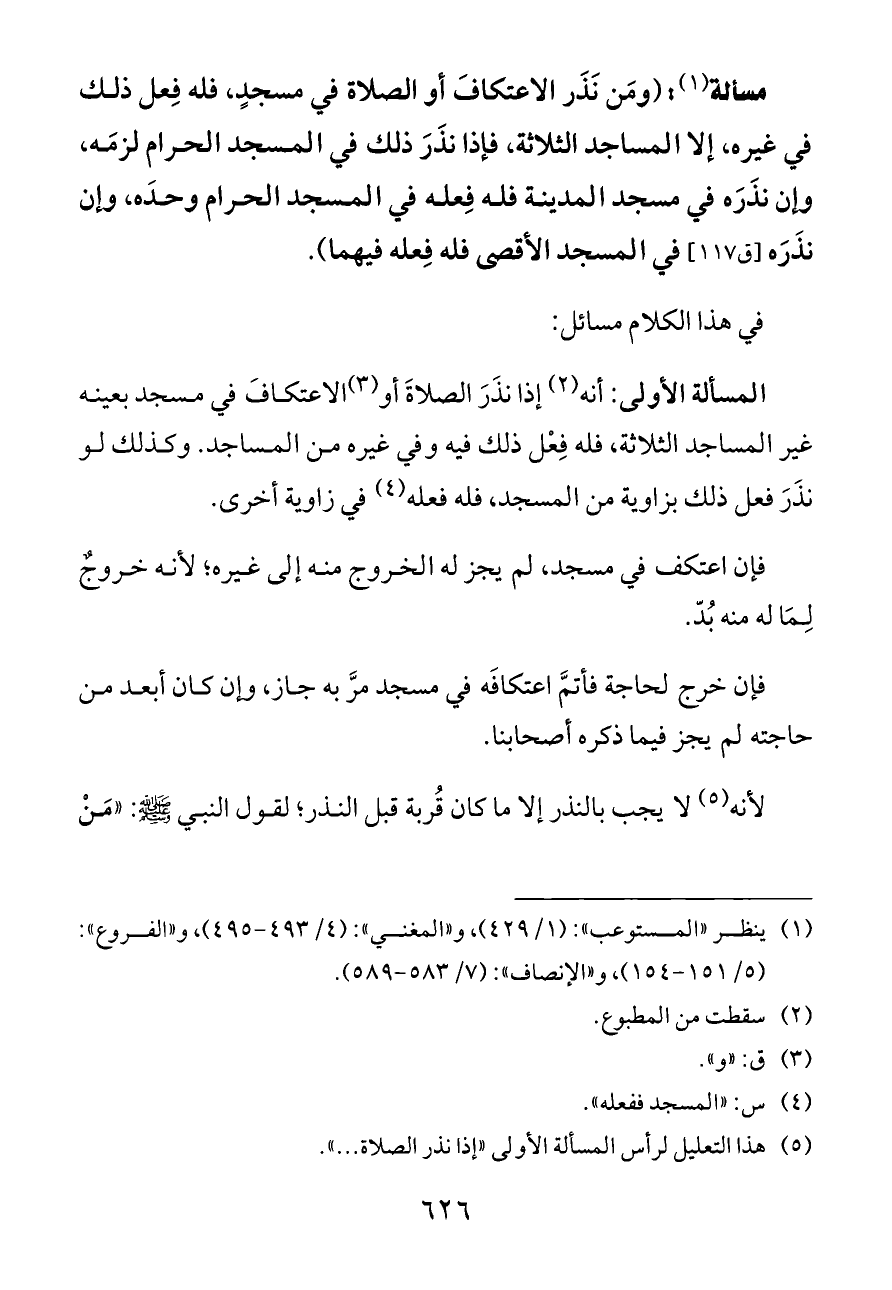 (¬٥) هذا التعليل لرأس المسألة الأولى «إذا نذر الصلاة ... ».