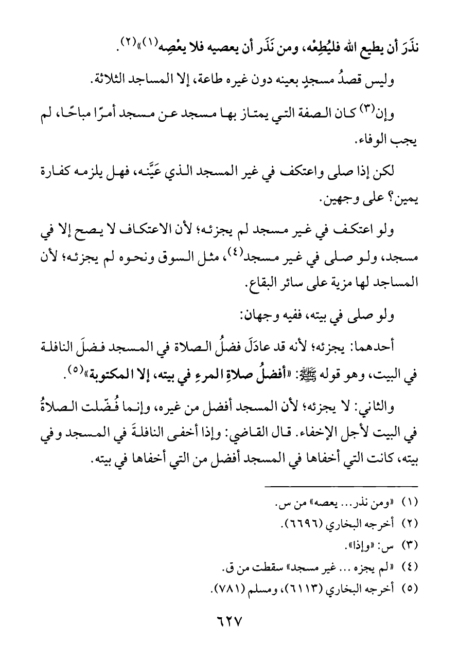 لكن إذا صلى واعتكف في غير المسجد الذي عَيَّنه، فهل يلزمه كفارة يمين؟ على وجهين.