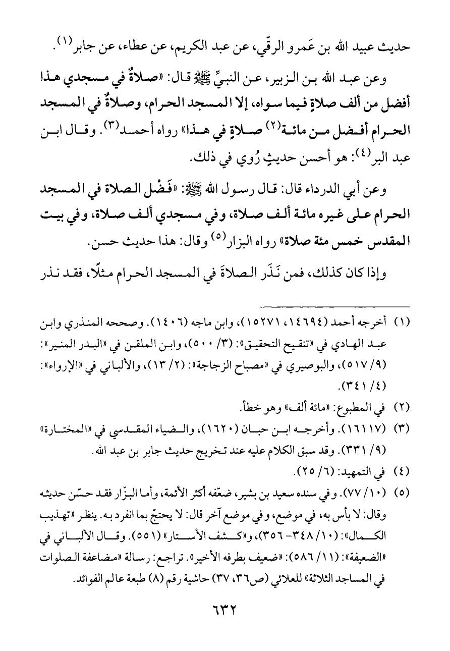 وعن عبد الله بن الزبير، عن النبيِّ - صلى الله عليه وسلم - قال: «صلاةٌ في مسجدي هذا أفضل من ألف صلاةٍ فيما سواه، إلا المسجد الحرام، وصلاةٌ في المسجد الحرام أفضل من مائة (¬٢) صلاةٍ في هذا» رواه أحمد (¬٣). وقال ابن عبد البر (¬٤): هو أحسن حديثٍ رُوي في ذلك.