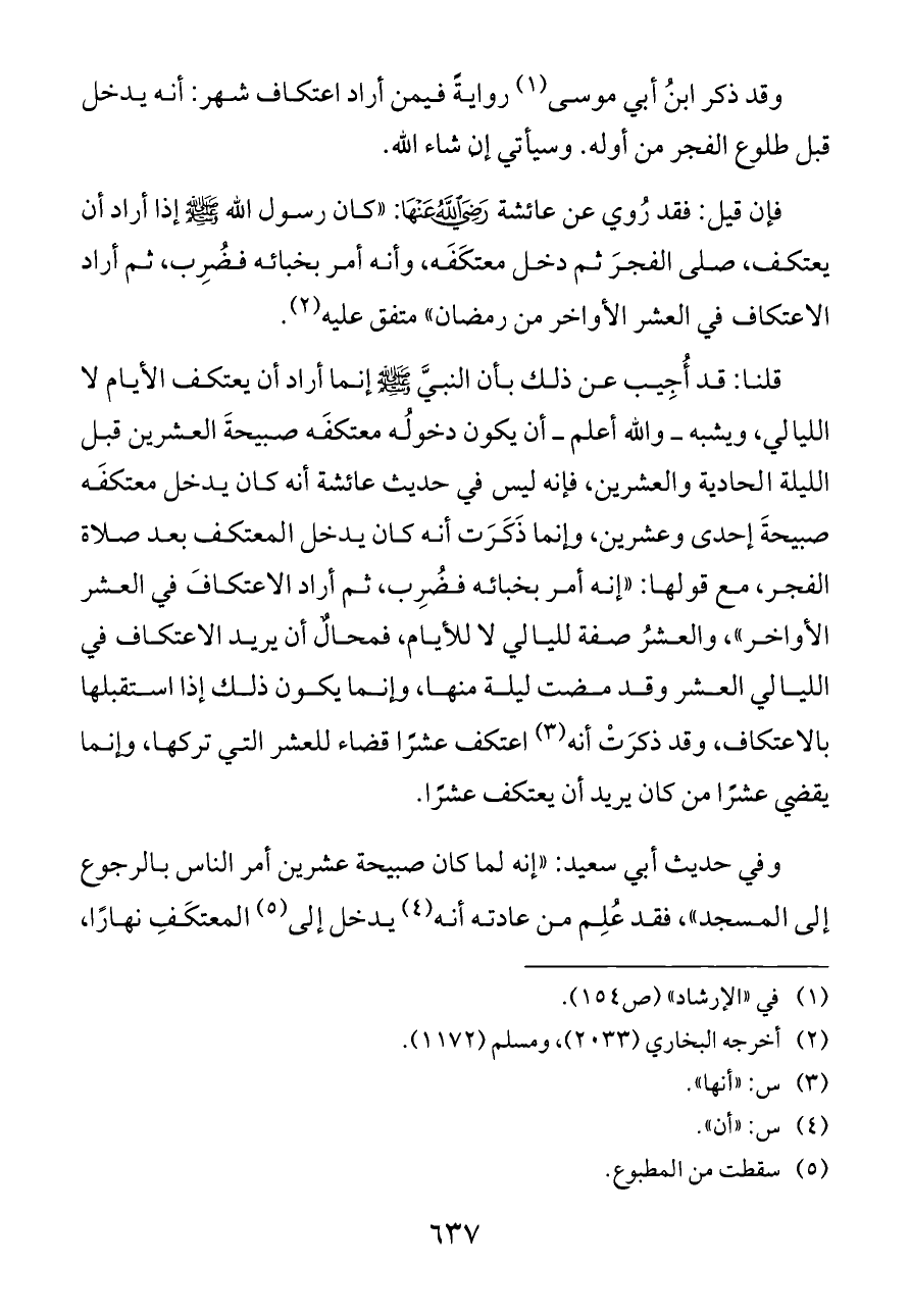 قلنا: قد أُجِيب عن ذلك بأن النبيَّ - صلى الله عليه وسلم - إنما أراد أن يعتكف الأيام لا الليالي، ويشبه ــ والله أعلم ــ أن يكون دخولُه معتكفَه صبيحةَ العشرين قبل الليلة الحادية والعشرين، فإنه ليس في حديث عائشة أنه كان يدخل معتكفَه صبيحةَ إحدى وعشرين، وإنما ذَكَرَت أنه كان يدخل المعتكف بعد صلاة الفجر، مع قولها: «إنه أمر بخبائه فضُرِب، ثم أراد الاعتكافَ في العشر الأواخر»، والعشرُ صفة لليالي لا للأيام، فمحالٌ أن يريد الاعتكاف في الليالي العشر وقد مضت ليلة منها، وإنما يكون ذلك إذا استقبلها بالاعتكاف، وقد ذكرَتْ أنه (¬٣) اعتكف عشرًا قضاء للعشر التي تركها، وإنما يقضي عشرًا من كان يريد أن يعتكف عشرًا.