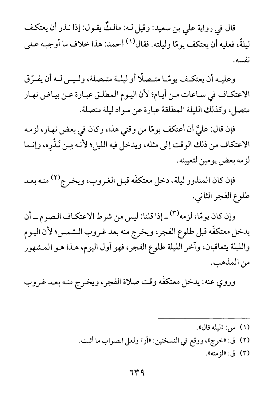 قال في رواية علي بن سعيد: وقيل له: مالكٌ يقول: إذا نذر أن يعتكف ليلةً، فعليه أن يعتكف يومًا وليلته. فقال (¬١) أحمد: هذا خلاف ما أوجبه على نفسه.