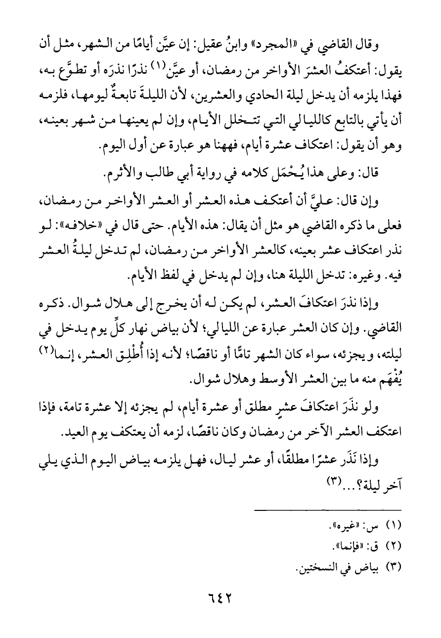 وقال القاضي في «المجرد» وابنُ عقيل: إن عيَّن أيامًا من الشهر، مثل أن يقول: أعتكفُ العشرَ الأواخر من رمضان، أو عيَّن (¬١) نذرًا نذرَه أو تطوَّع به، فهذا يلزمه أن يدخل ليلة الحادي والعشرين، لأن الليلةَ تابعةٌ ليومها، فلزمه أن يأتي بالتابع كالليالي التي تتخلل الأيام، وإن لم يعينها من شهر بعينه، وهو أن يقول: اعتكاف عشرة أيام، فههنا هو عبارة عن أول اليوم.