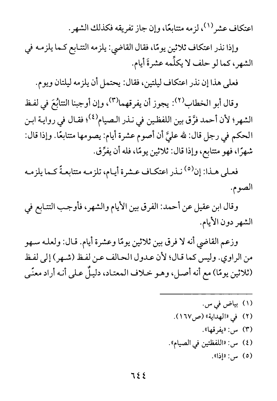 وقال أبو الخطاب (¬٢): يجوز أن يفرقهما (¬٣)، وإن أوجبنا التتابُعَ في لفظ الشهر؛ لأن أحمد فرَّق بين اللفظين في نذر الصيام (¬٤)؛ فقال في رواية ابن الحكم في رجل قال: لله عليَّ أن أصوم عشرة أيام: يصومها متتابعًا. وإذا قال: شهرًا، فهو متتابع، وإذا قال: ثلاثين يومًا، فله أن يفرِّق.