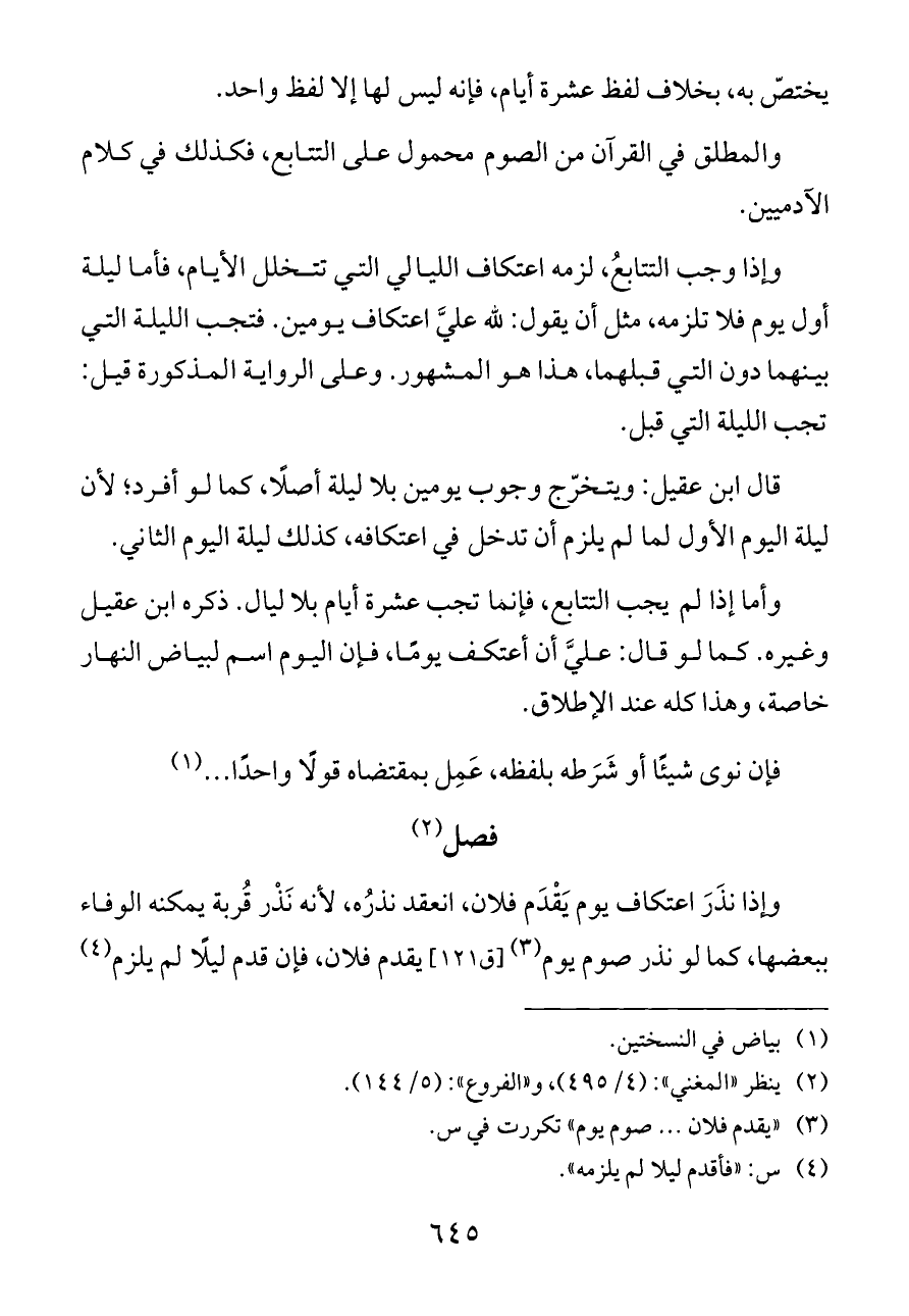 وأما إذا لم يجب التتابع، فإنما تجب عشرة أيام بلا ليال. ذكره ابن عقيل وغيره. كما لو قال: عليَّ أن أعتكف يومًا، فإن اليوم اسم لبياض النهار خاصة، وهذا كله عند الإطلاق.