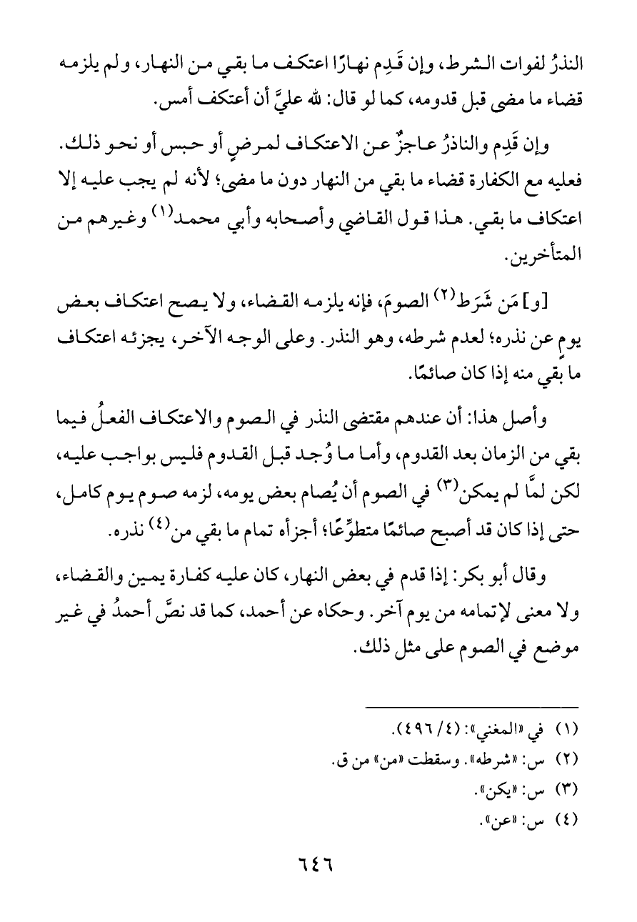 وأصل هذا: أن عندهم مقتضى النذر في الصوم والاعتكاف الفعلُ فيما بقي من الزمان بعد القدوم، وأما ما وُجد قبل القدوم فليس بواجب عليه، لكن لمَّا لم يمكن (¬٣) في الصوم أن يُصام بعض يومه، لزمه صوم يوم كامل، حتى إذا كان قد أصبح صائمًا متطوِّعًا؛ أجزأه تمام ما بقي من (¬٤) نذره.