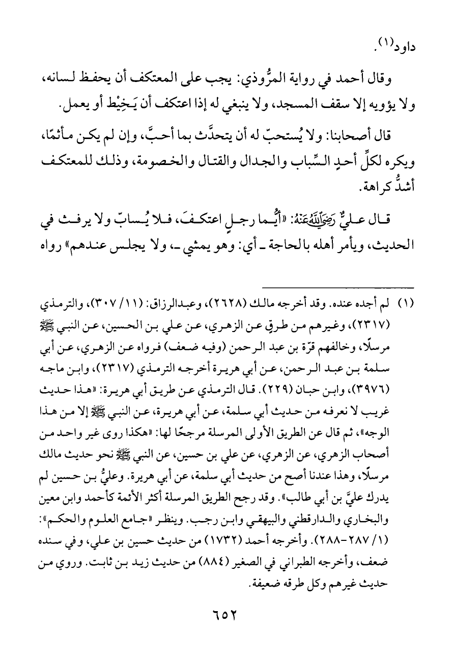 قال عليٌّ - رضي الله عنه -: «أيُّما رجلٍ اعتكفَ، فلا يُسابّ ولا يرفث في الحديث، ويأمر أهله بالحاجة ــ أي: وهو يمشي ــ، ولا يجلس عندهم» رواه