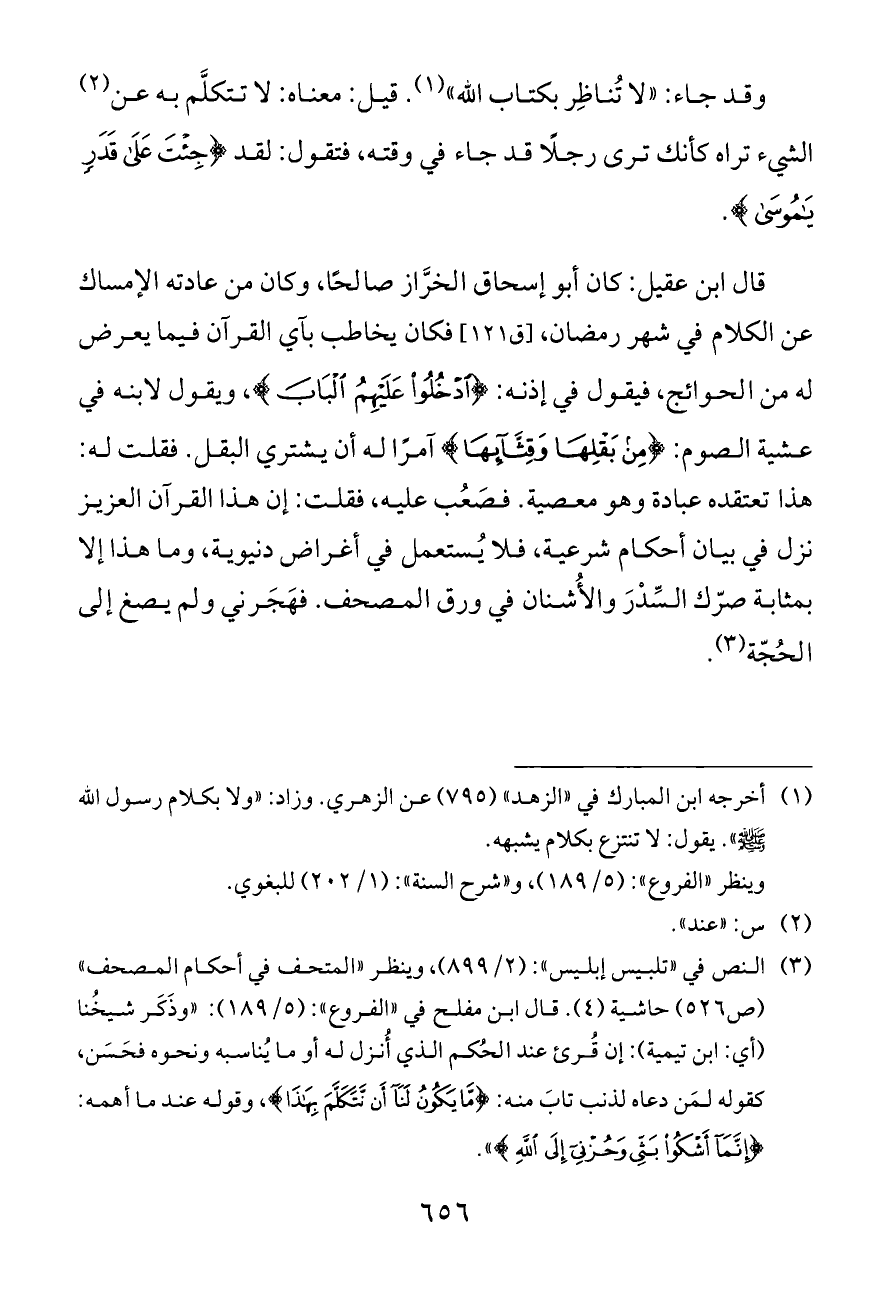 (¬٣) النص في «تلبيس إبليس»: (٢/ ٨٩٩)، وينظر «المتحف في أحكام المصحف» (ص ٥٢٦) حاشية (٤). قال ابن مفلح في «الفروع»: (٥/ ١٨٩): «وذَكَر شيخُنا (أي: ابن تيمية): إن قُرئ عند الحُكم الذي أُنزل له أو ما يُناسبه ونحوه فحَسَن، كقوله لمَن دعاه لذنب تابَ منه: {مَا يَكُونُ لَنَا أَنْ نَتَكَلَّمَ بِهَذَا}، وقوله عند ما أهمه: {إِنَّمَا أَشْكُو بَثِّي وَحُزْنِي إِلَى اللَّهِ}».