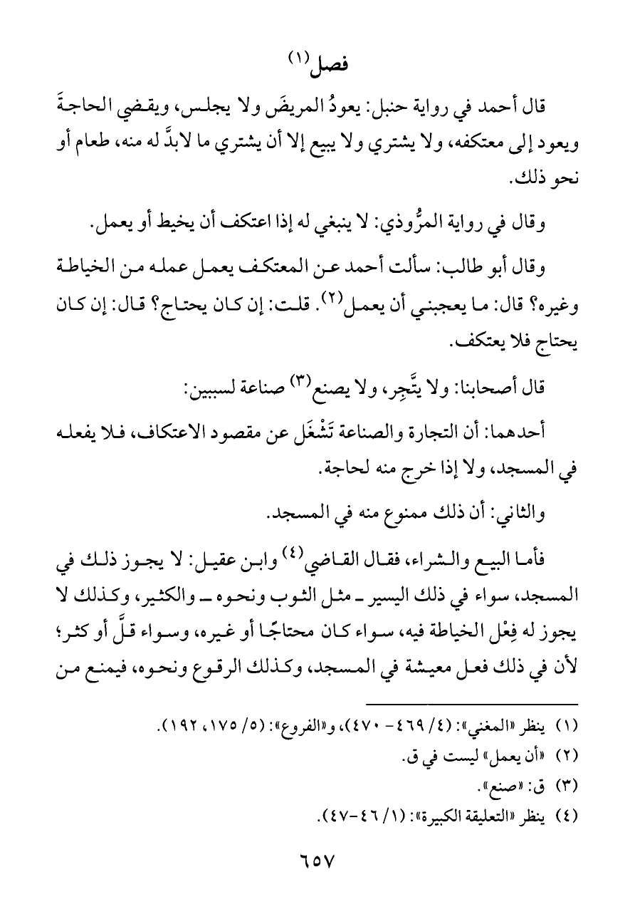وقال أبو طالب: سألت أحمد عن المعتكف يعمل عمله من الخياطة وغيره؟ قال: ما يعجبني أن يعمل (¬٢). قلت: إن كان يحتاج؟ قال: إن كان يحتاج فلا يعتكف.
