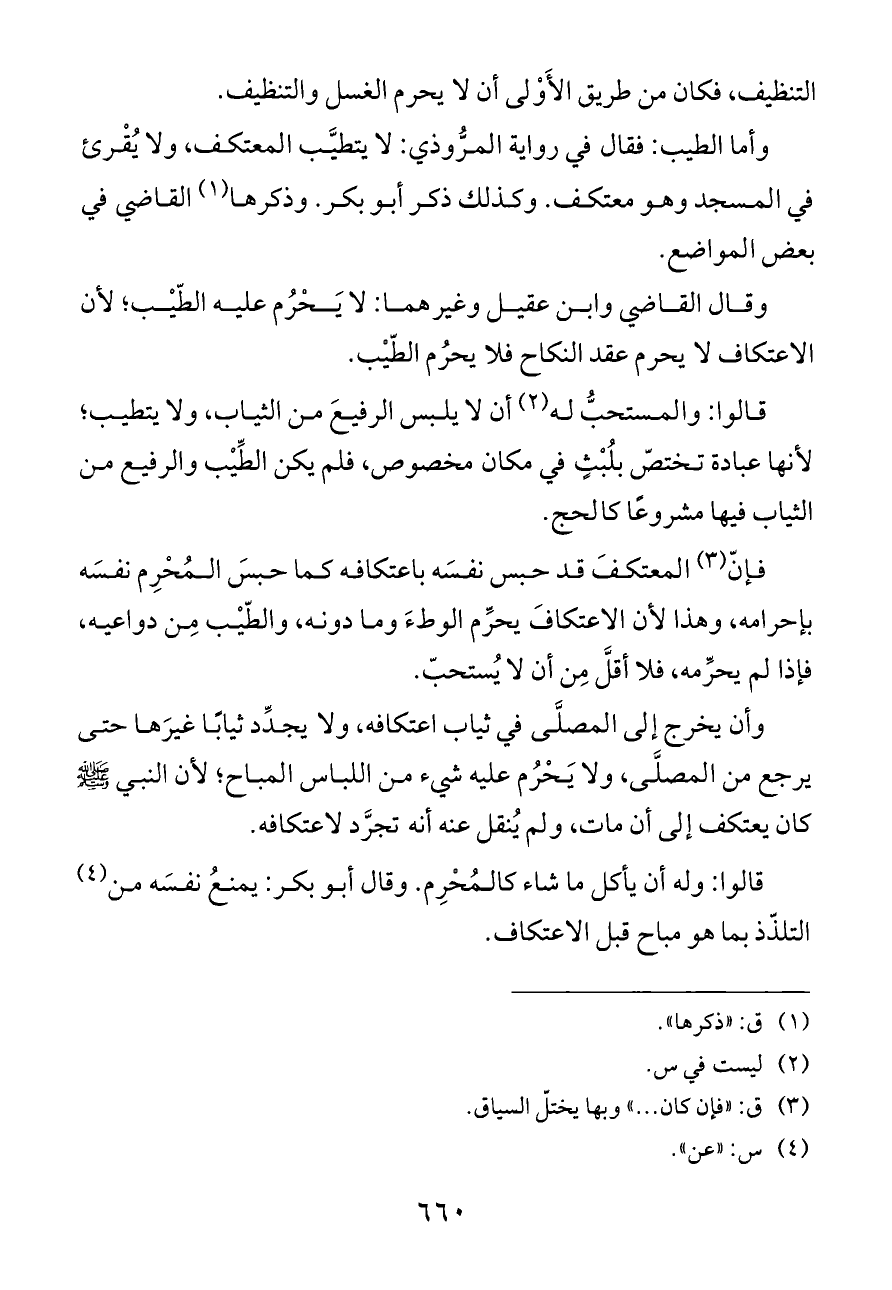 فإنّ (¬٣) المعتكفَ قد حبس نفسَه باعتكافه كما حبسَ المُحْرِم نفسَه بإحرامه، وهذا لأن الاعتكافَ يحرِّم الوطءَ وما دونه، والطّيْب مِن دواعيه، فإذا لم يحرِّمه، فلا أقلَّ مِن أن لا يُستحبّ.