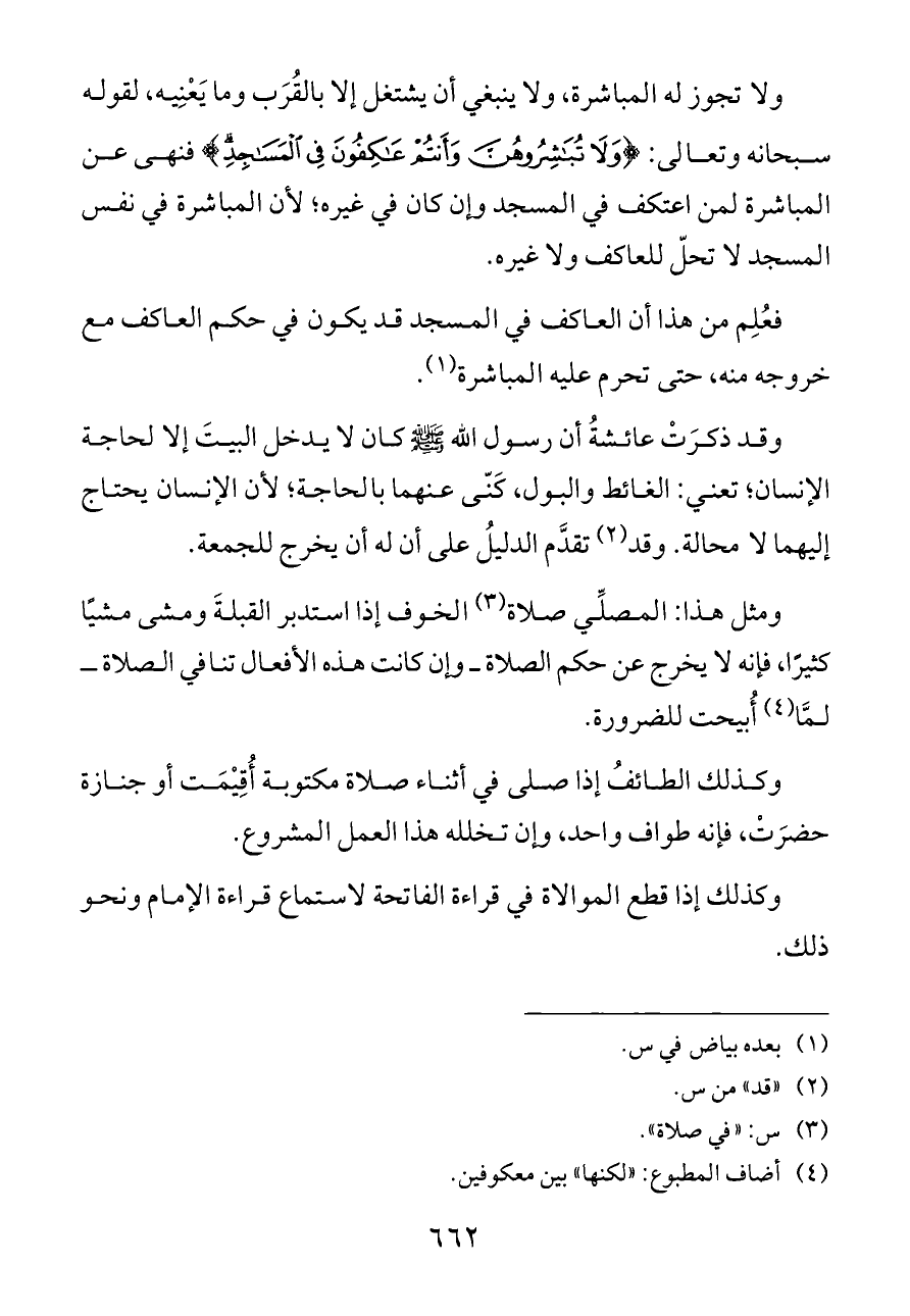 ولا تجوز له المباشرة، ولا ينبغي أن يشتغل إلا بالقُرَب وما يَعْنِيه، لقوله سبحانه وتعالى: {وَلَا تُبَاشِرُوهُنَّ وَأَنْتُمْ عَاكِفُونَ فِي الْمَسَاجِدِ} فنهى عن المباشرة لمن اعتكف في المسجد وإن كان في غيره؛ لأن المباشرة في نفس المسجد لا تحلّ للعاكف ولا غيره.