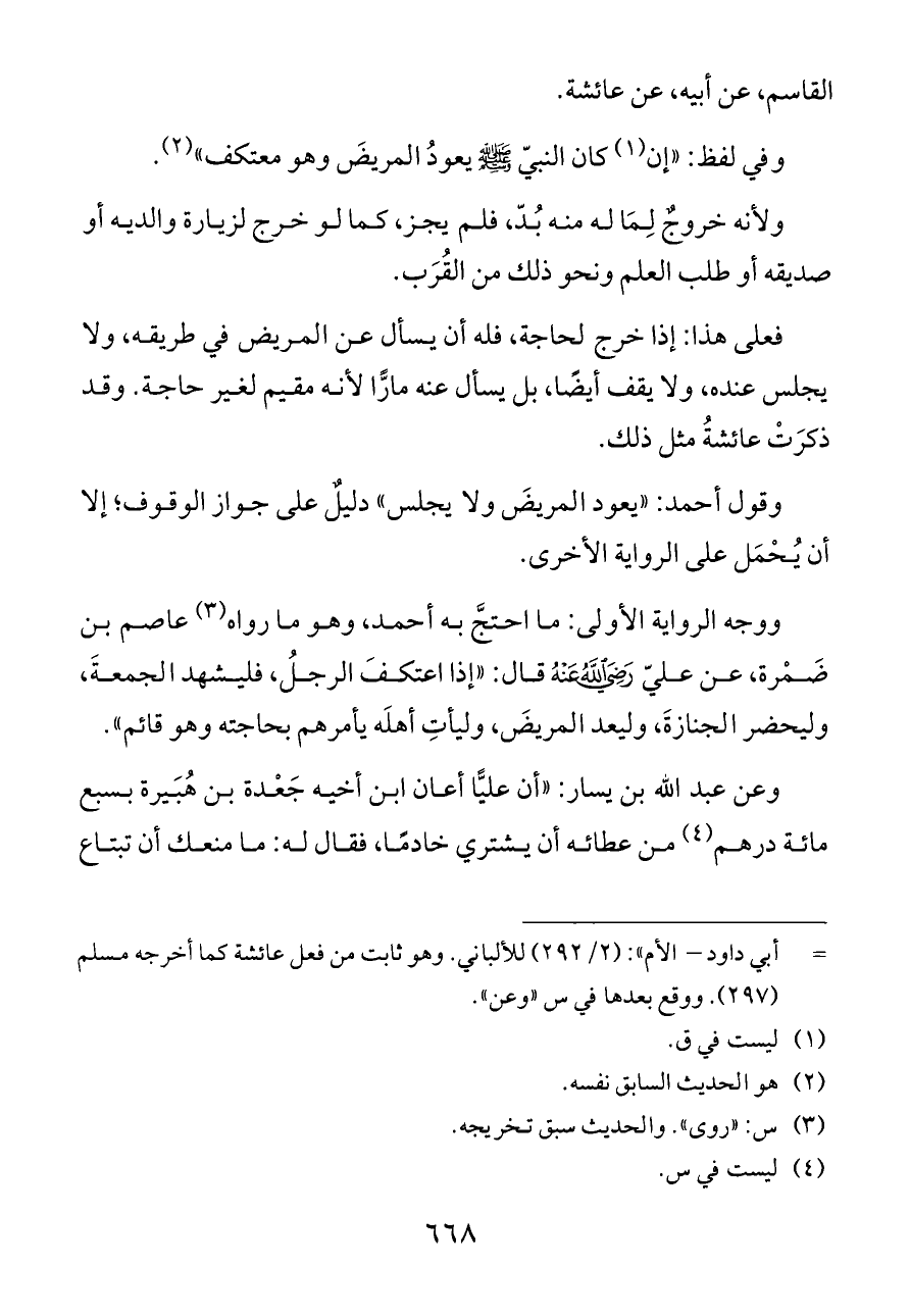 فعلى هذا: إذا خرج لحاجة، فله أن يسأل عن المريض في طريقه، ولا يجلس عنده، ولا يقف أيضًا، بل يسأل عنه مارًّا لأنه مقيم لغير حاجة. وقد ذكرَتْ عائشةُ مثل ذلك.