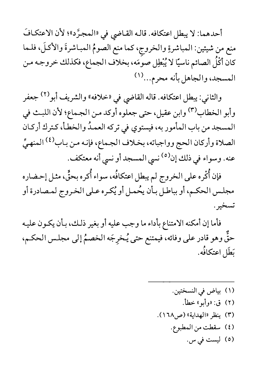أحدهما: لا يبطل اعتكافه. قاله القاضي في «المجرَّد»؛ لأن الاعتكافَ منع من شيئين: المباشرةِ والخروجِ، كما منع الصومُ المباشرةَ والأكلَ، فلما كان أكْلُ الصائم ناسيًا لا يُبْطِل صومَه، بخلاف الجماع، فكذلك خروجه من المسجد، والجاهل بأنه محرم ... (¬١)