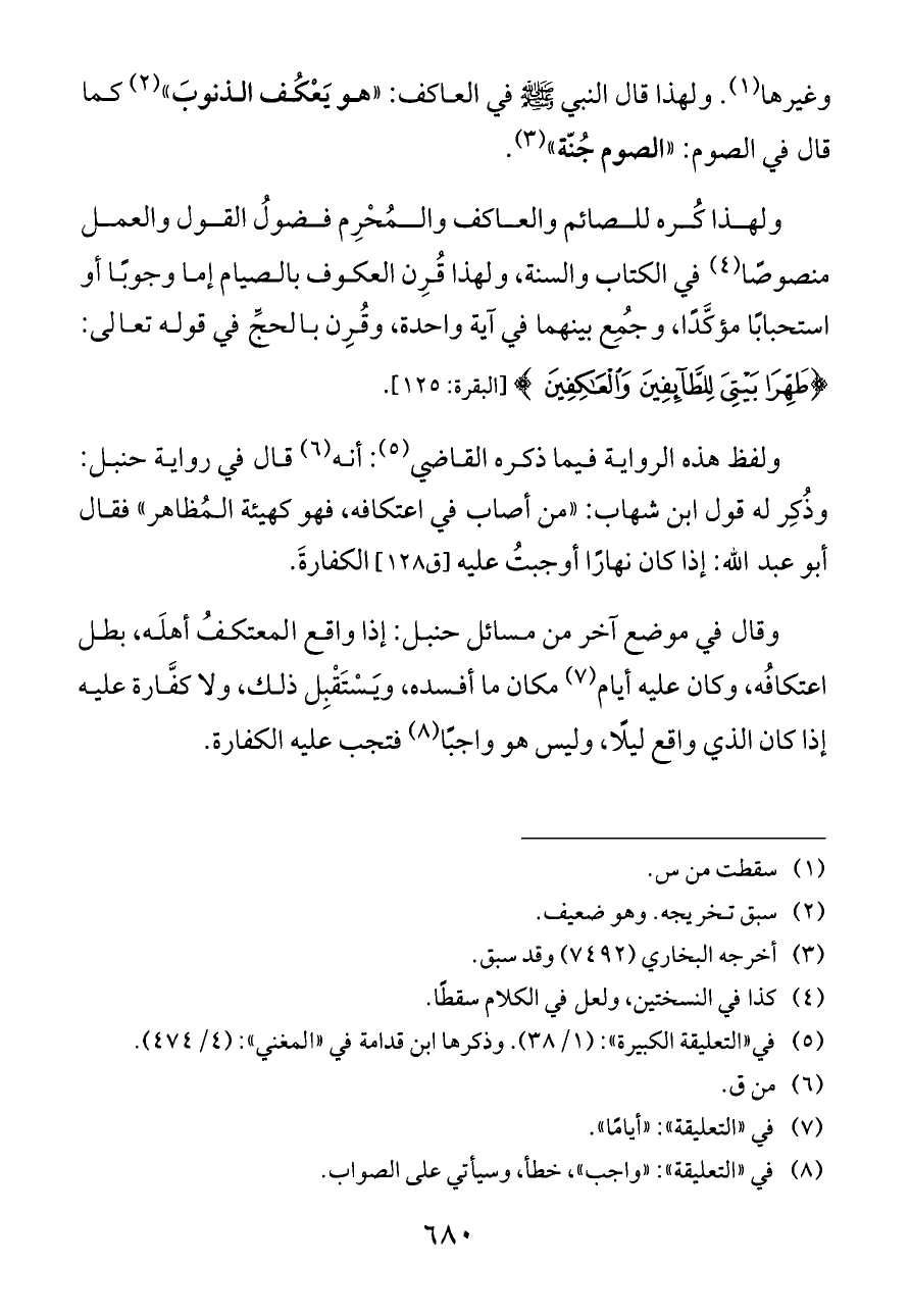 ولهذا كُره للصائم والعاكف والمُحْرِم فضولُ القول والعمل منصوصًا (¬٤) في الكتاب والسنة، ولهذا قُرِن العكوف بالصيام إما وجوبًا أو استحبابًا مؤكَّدًا، وجُمِع بينهما في آية واحدة، وقُرِن بالحجِّ في قوله تعالى: {طَهِّرَا بَيْتِيَ لِلطَّائِفِينَ وَالْعَاكِفِينَ} [البقرة: ١٢٥].