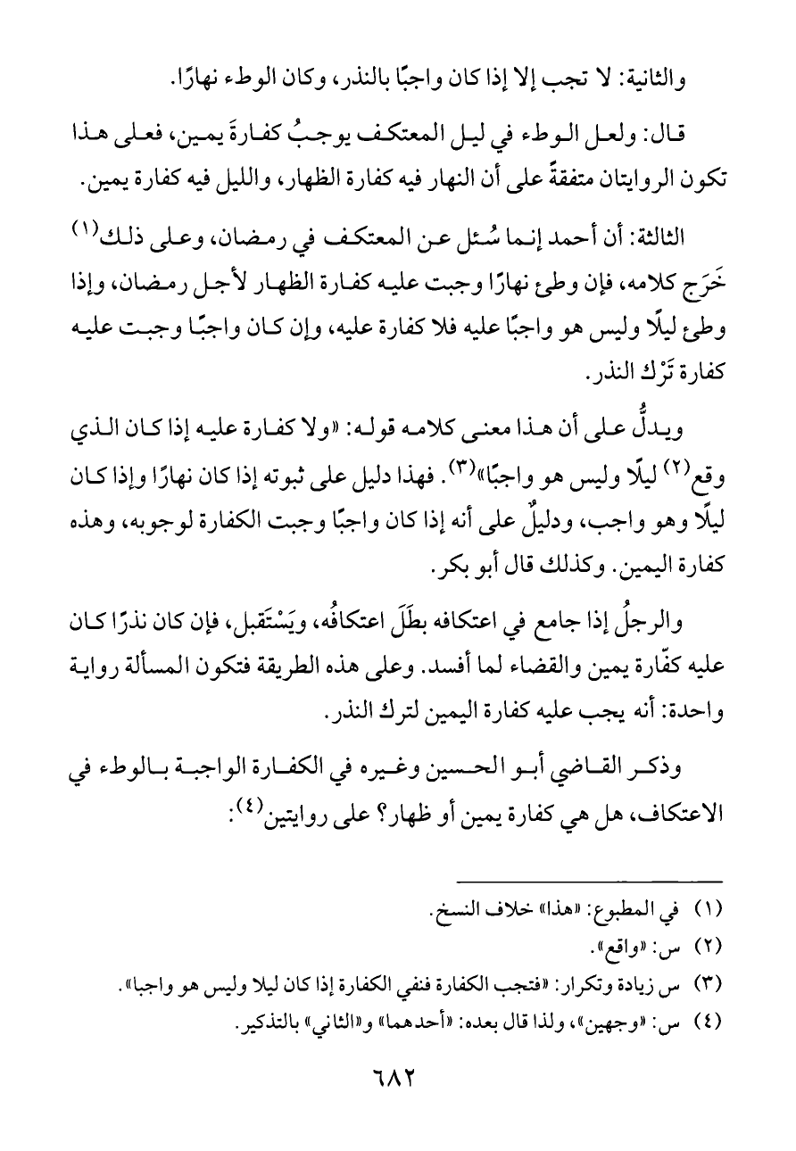 الثالثة: أن أحمد إنما سُئل عن المعتكف في رمضان، وعلى ذلك (¬١) خَرَج كلامه، فإن وطئ نهارًا وجبت عليه كفارة الظهار لأجل رمضان، وإذا وطئ ليلًا وليس هو واجبًا عليه فلا كفارة عليه، وإن كان واجبًا وجبت عليه كفارة تَرْك النذر.