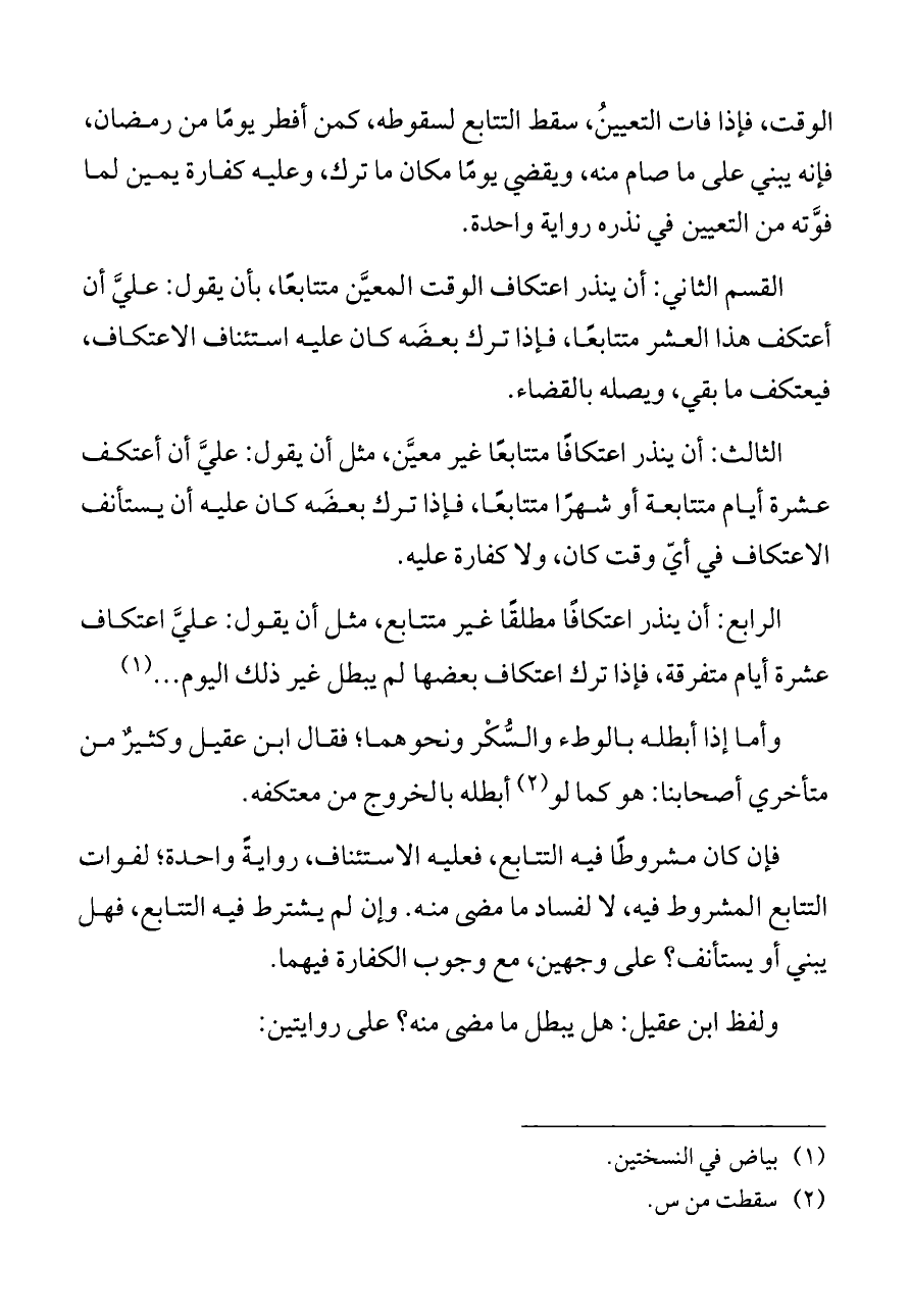 الثالث: أن ينذر اعتكافًا متتابعًا غير معيَّن، مثل أن يقول: عليَّ أن أعتكف عشرة أيام متتابعة أو شهرًا متتابعًا، فإذا ترك بعضَه كان عليه أن يستأنف الاعتكاف في أيّ وقت كان، ولا كفارة عليه.