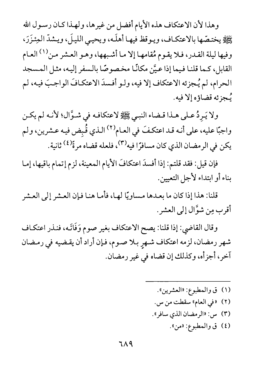 ولا يَرِدُ على هذا قضاء النبي - صلى الله عليه وسلم - لاعتكافه في شوَّال؛ لأنه لم يكن واجبًا عليه، على أنه قد اعتكفَ في العام (¬٢) الذي قُبِض فيه عشرين، ولم يكن في الرمضان الذي كان مسافرًا فيه (¬٣)، فلعله قضاه مرةً (¬٤) ثانية.