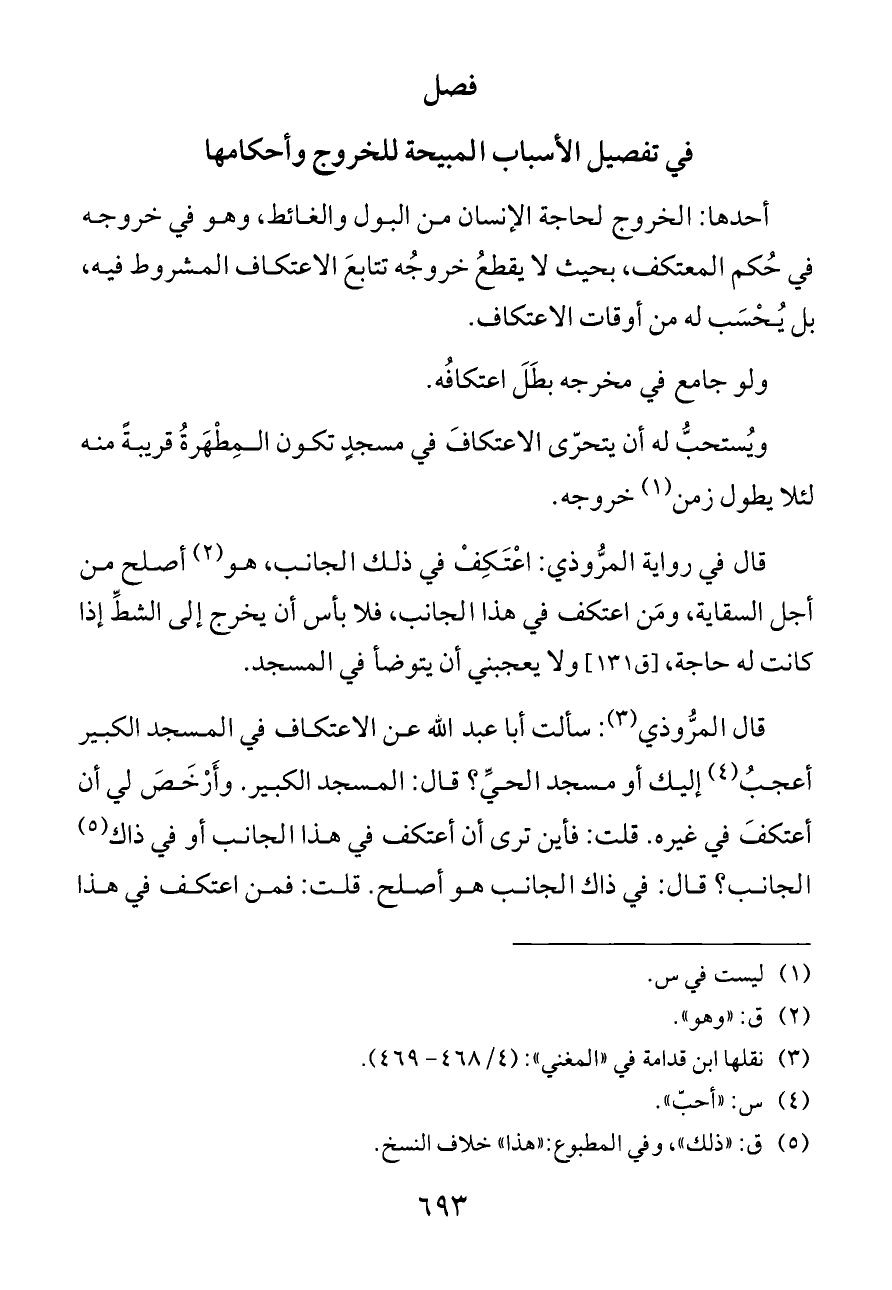 قال في رواية المرُّوذي: اعْتَكِفْ في ذلك الجانب، هو (¬٢) أصلح من أجل السقاية، ومَن اعتكف في هذا الجانب، فلا بأس أن يخرج إلى الشطِّ إذا كانت له حاجة، [ق ١٣١] ولا يعجبني أن يتوضأ في المسجد.