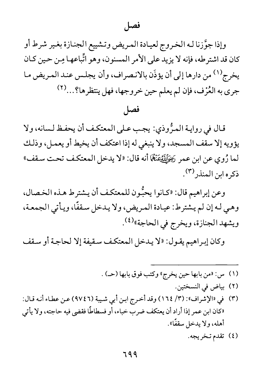 وعن إبراهيم قال: «كانوا يحبُّون للمعتكف أن يشترط هذه الخصال، وهي له إن لم يشترط: عيادة المريض، ولا يدخل سقفًا، ويأتي الجمعة، ويشهد الجنازة، ويخرج في الحاجة» (¬٤).