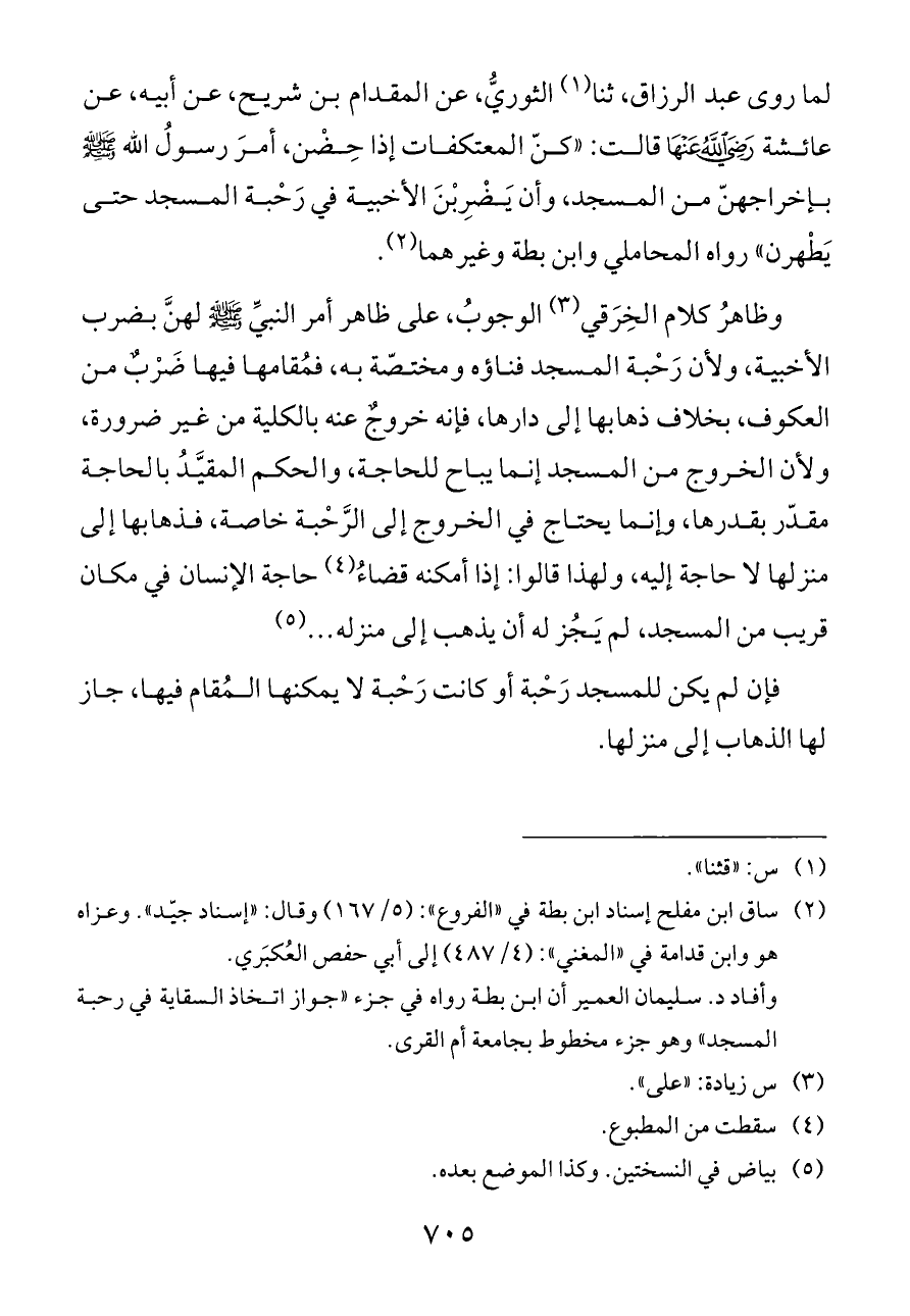 وظاهرُ كلام الخِرَقي (¬٣) الوجوبُ، على ظاهر أمر النبيِّ - صلى الله عليه وسلم - لهنَّ بضرب الأخبية، ولأن رَحْبة المسجد فناؤه ومختصّة به، فمُقامها فيها ضَرْبٌ من العكوف، بخلاف ذهابها إلى دارها، فإنه خروجٌ عنه بالكلية من غير ضرورة، ولأن الخروج من المسجد إنما يباح للحاجة، والحكم المقيَّدُ بالحاجة مقدّر بقدرها، وإنما يحتاج في الخروج إلى الرَّحْبة خاصة، فذهابها إلى منزلها لا حاجة إليه، ولهذا قالوا: إذا أمكنه قضاءُ (¬٤) حاجة الإنسان في مكان قريب من المسجد، لم يَجُز له أن يذهب إلى منزله ... (¬٥)