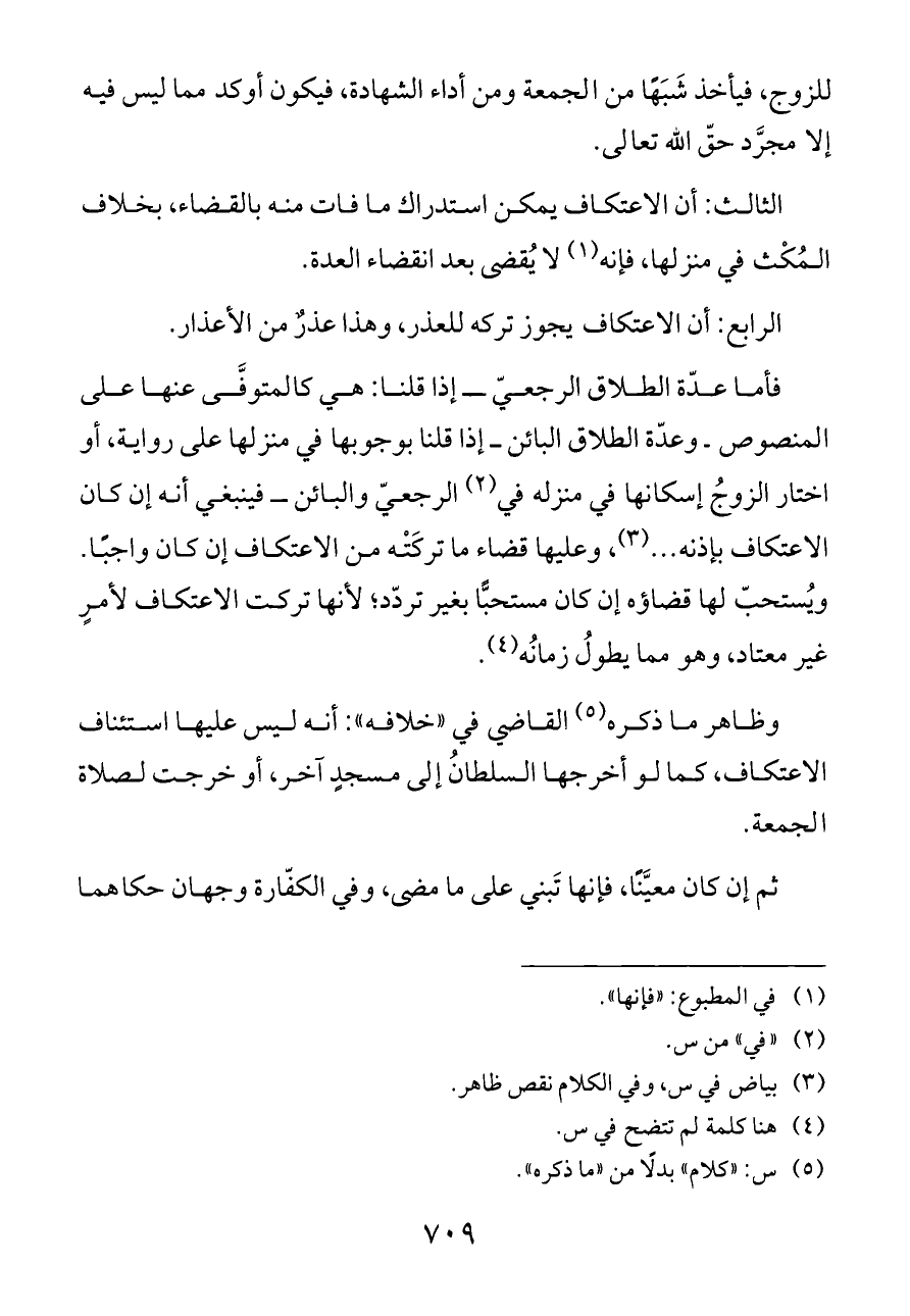 فأما عدّة الطلاق الرجعيّ ــ إذا قلنا: هي كالمتوفَّى عنها على المنصوص ـ وعدّة الطلاق البائن ــ إذا قلنا بوجوبها في منزلها على رواية، أو اختار الزوجُ إسكانها في منزله في (¬٢) الرجعيّ والبائن ــ فينبغي أنه إن كان الاعتكاف بإذنه ... (¬٣)، وعليها قضاء ما تركَتْه من الاعتكاف إن كان واجبًا. ويُستحبّ لها قضاؤه إن كان مستحبًّا بغير تردّد؛ لأنها تركت الاعتكاف لأمرٍ غير معتاد، وهو مما يطولُ زمانُه (¬٤).