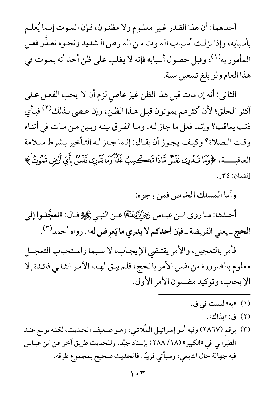 أحدهما: أن هذا القدر غير معلوم ولا مظنون، فإن الموت إنما يُعلم بأسبابه، وإذا نزلت أسباب الموت من المرض الشديد ونحوه تعذَّر فعل المأمور به (¬١)، وقبل حصول أسبابه فإنه لا يغلب على ظن أحد أنه يموت في هذا العام ولو بلغ تسعين سنة.