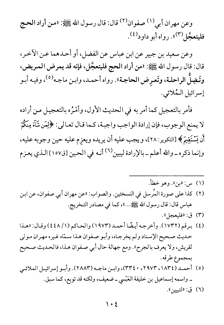 وعن مهران أبي (¬١) صفوان (¬٢) قال: قال رسول الله - صلى الله عليه وسلم -: «من أراد الحج فليتعجَّل (¬٣)». رواه أبو داود (¬٤).