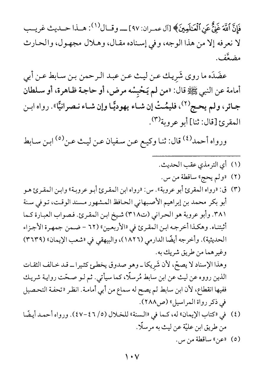 عضَدَه ما روى شَرِيك عن ليث عن عبد الرحمن بن سابط عن أبي أمامة عن النبي - صلى الله عليه وسلم - قال: «من لم يَحْبِسْه مرض، أو حاجة ظاهرة، أو سلطان جائر، ولم يحج (¬٢)، فليمُتْ إن شاء يهوديًّا وإن شاء نصرانيًّا». رواه ابن المقرئ [قال: ثنا] أبو عروبة (¬٣).