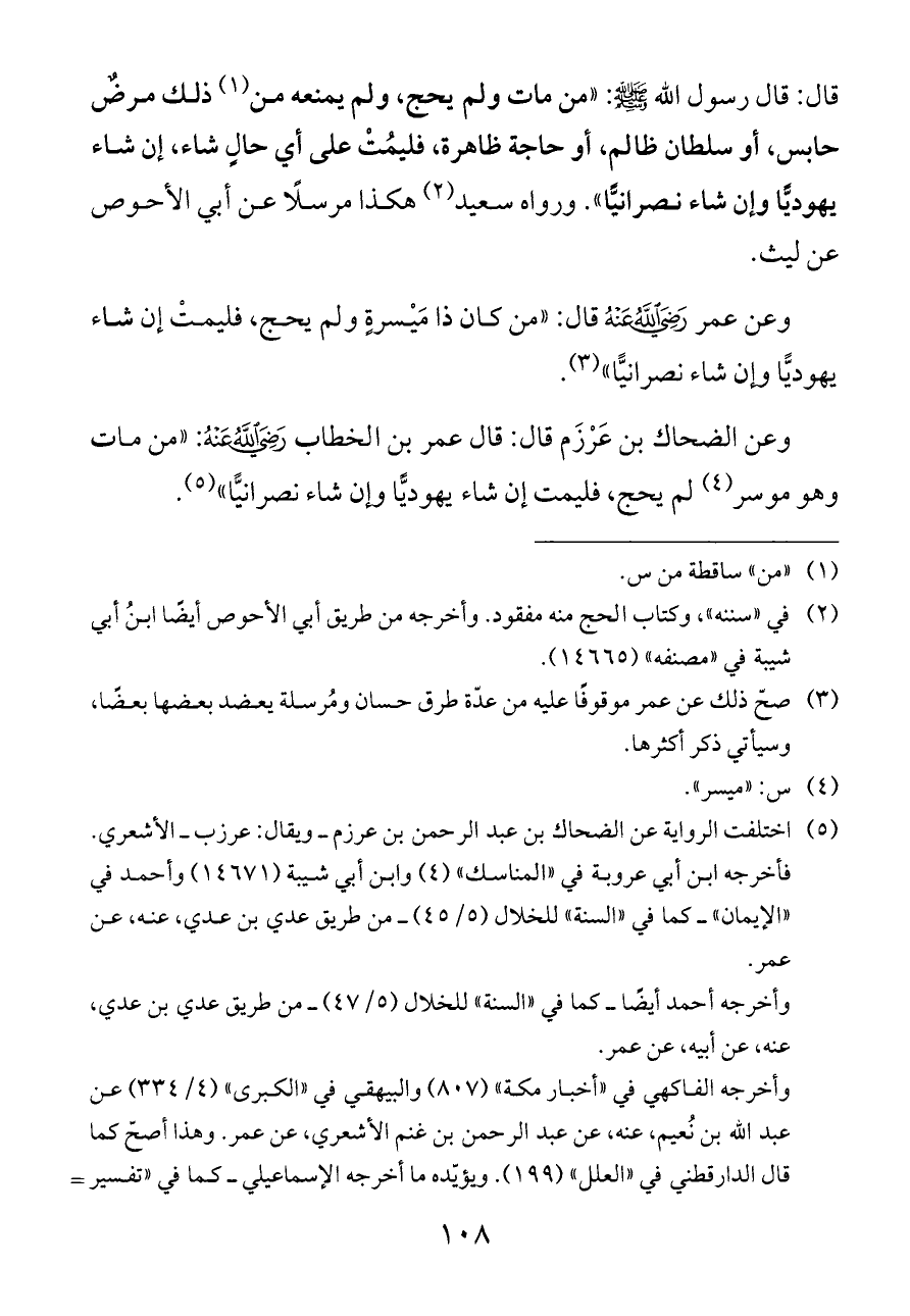 قال: قال رسول الله - صلى الله عليه وسلم -: «من مات ولم يحج، ولم يمنعه من (¬١) ذلك مرضٌ حابس، أو سلطان ظالم، أو حاجة ظاهرة، فليمُتْ على أي حالٍ شاء، إن شاء يهوديًّا وإن شاء نصرانيًّا». ورواه سعيد (¬٢) هكذا مرسلًا عن أبي الأحوص عن ليث.