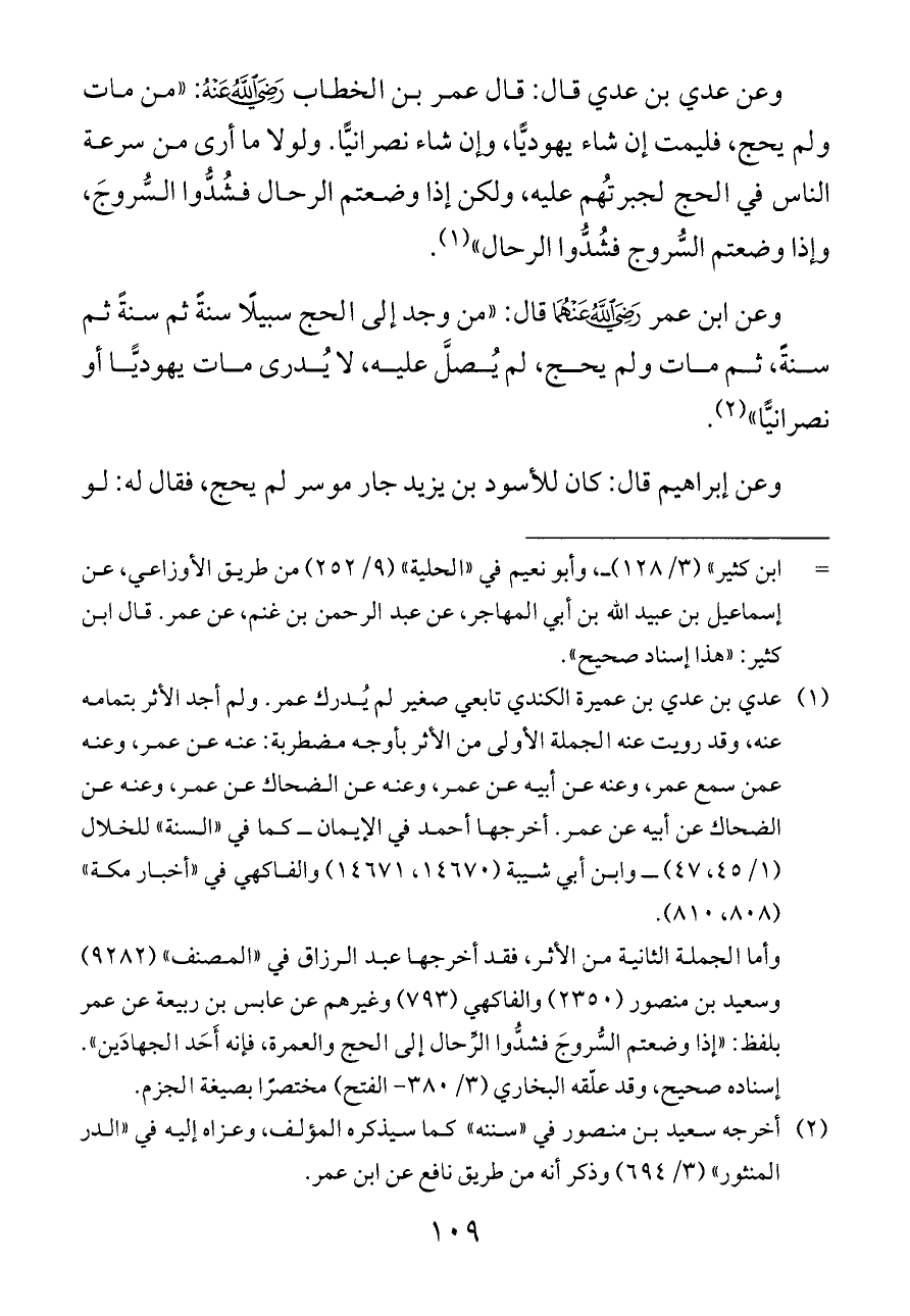 وعن ابن عمر - رضي الله عنهما - قال: «من وجد إلى الحج سبيلًا سنةً ثم سنةً ثم سنةً، ثم مات ولم يحج، لم يُصلَّ عليه، لا يُدرى مات يهوديًّا أو نصرانيًّا» (¬٢).