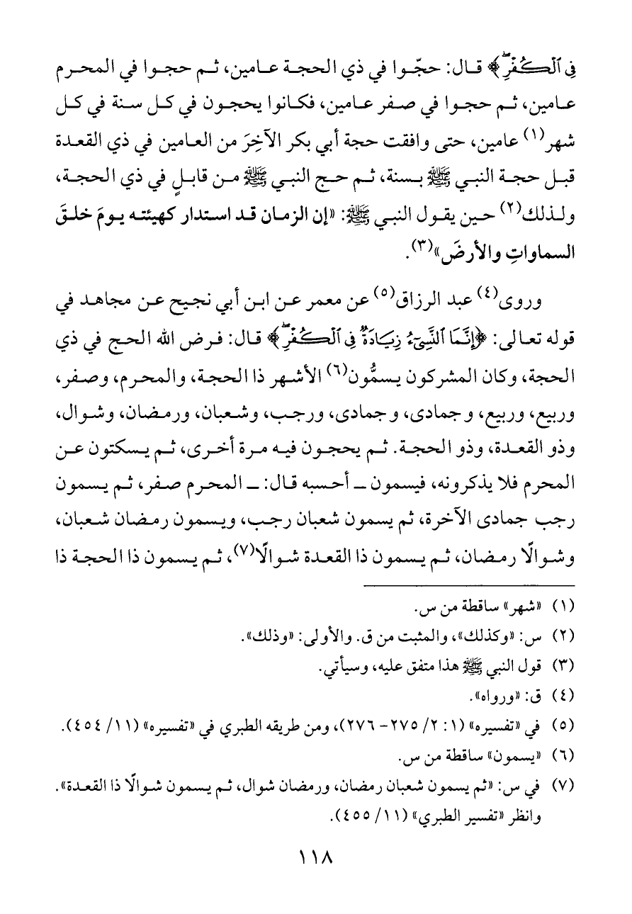 (¬٧) في س: «ثم يسمون شعبان رمضان، ورمضان شوال، ثم يسمون شوالًا ذا القعدة». وانظر «تفسير الطبري» (١١/ ٤٥٥).