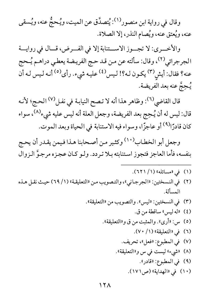 (¬٢) في النسختين: «الجرجاني»، والتصويب من «التعليقة» (١/ ٦٩) حيث نقل هذه المسألة.