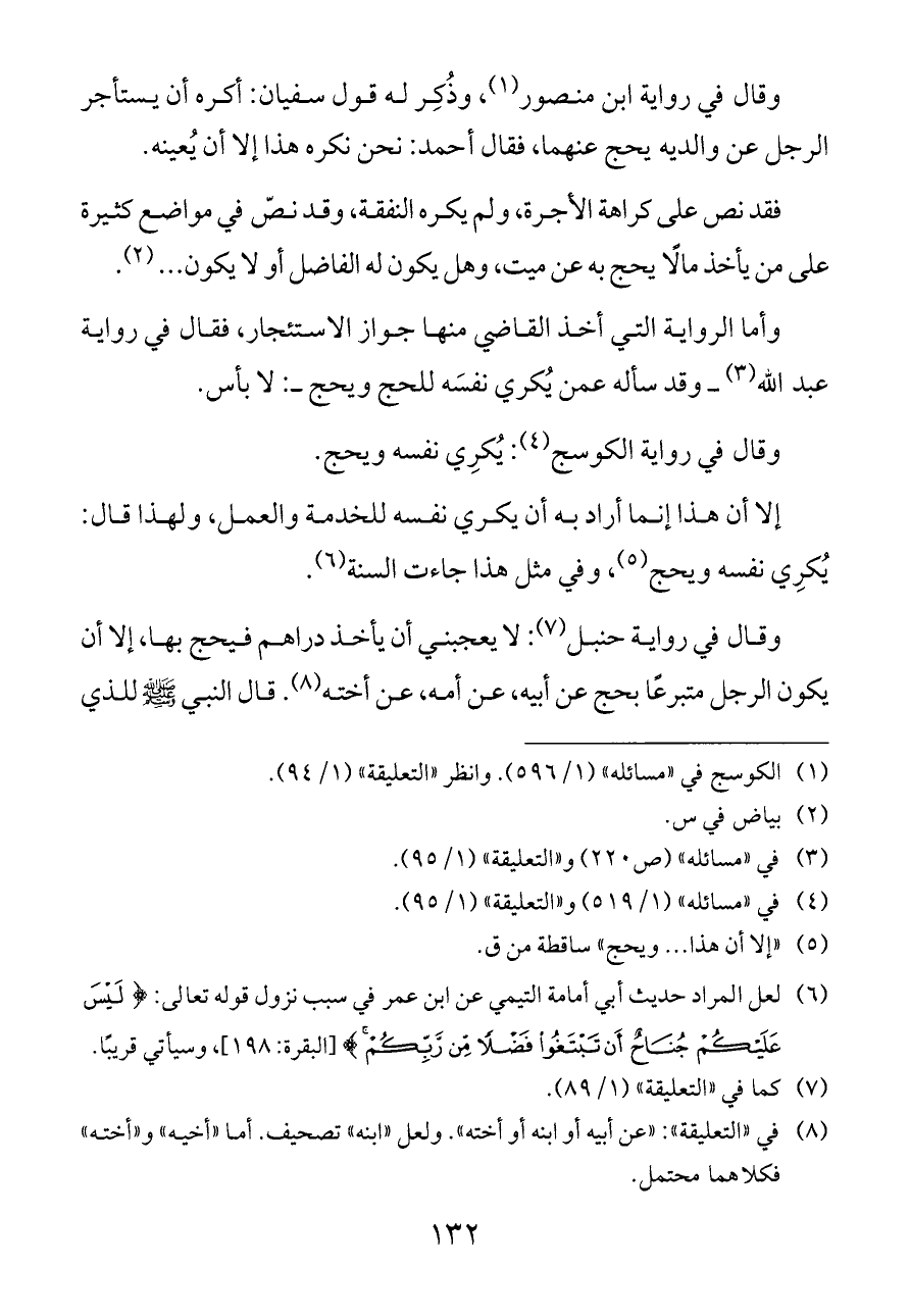 فقد نص على كراهة الأجرة، ولم يكره النفقة، وقد نصّ في مواضع كثيرة على من يأخذ مالًا يحج به عن ميت، وهل يكون له الفاضل أو لا يكون ... (¬٢).
