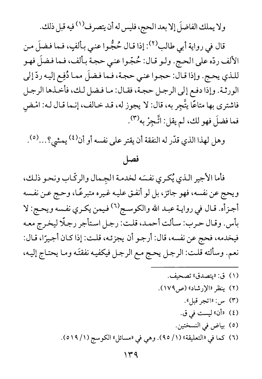 قال في رواية أبي طالب (¬٢): إذا قال حُجُّوا عني بألفٍ، فما فضلَ من الألف ردّه على الحج. ولو قال: حُجّوا عني حجة بألف، فما فضلَ فهو للذي يحج. وإذا قال: حجوا عني حجة، فما فضلَ مما دُفِع إليه ردّ إلى الورثة. وإذا دفع إلى الرجل حجة، فقال: ما فضل لك، فأخذها الرجل فاشترى بها متاعًا يتَّجِر به، قال: لا يجوز له، قد خالف، إنما قال له: امْضِ فما فضلَ فهو لك، لم يقل: اتَّجِرْ به (¬٣).