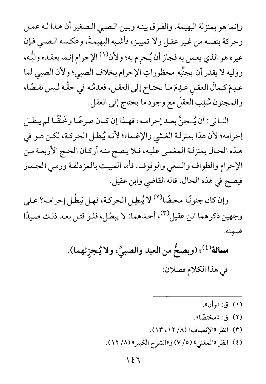 وإنما هو بمنزلة البهيمة. والفرق بينه وبين الصبي الصغير أن هذا له عمل وحركة بنفسه من غير عقل ولا تمييز، فأشبه البهيمةَ، وعكسه الصبي فإن غيره هو الذي يعمل به فجاز أن يُحرِم به؛ ولأن (¬١) الإحرام إنما يعقده وليُّه، ووليه لا يقدر أن يجنِّبه محظوراتِ الإحرام بخلاف الصبي؛ ولأن الصبي لما عدِمَ كمالَ العقلِ عدِمَ ما يحتاج إلى العقل، فعدمُه في حقّه ليس نقصًا، والمجنون سُلِب العقلَ مع وجود ما يحتاج إلى العقل.