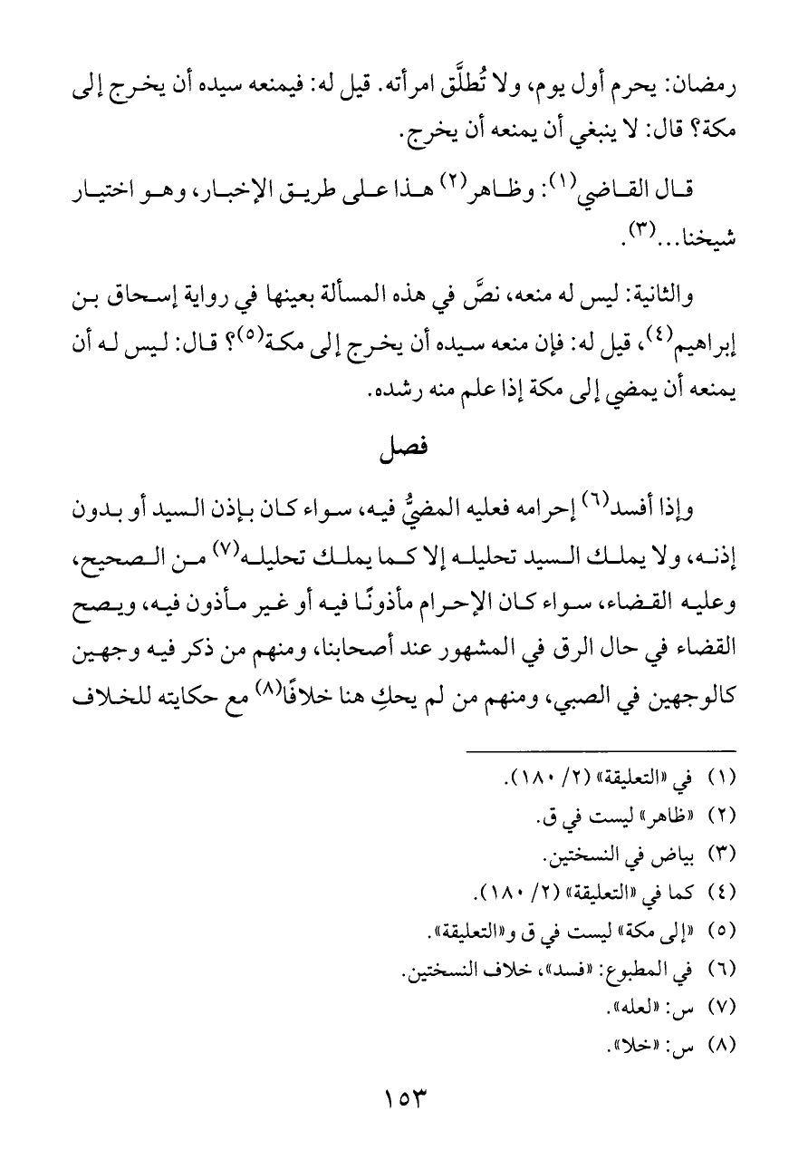 رمضان: يحرم أول يوم، ولا تُطلَّق امرأته. قيل له: فيمنعه سيده أن يخرج إلى مكة؟ قال: لا ينبغي أن يمنعه أن يخرج.
