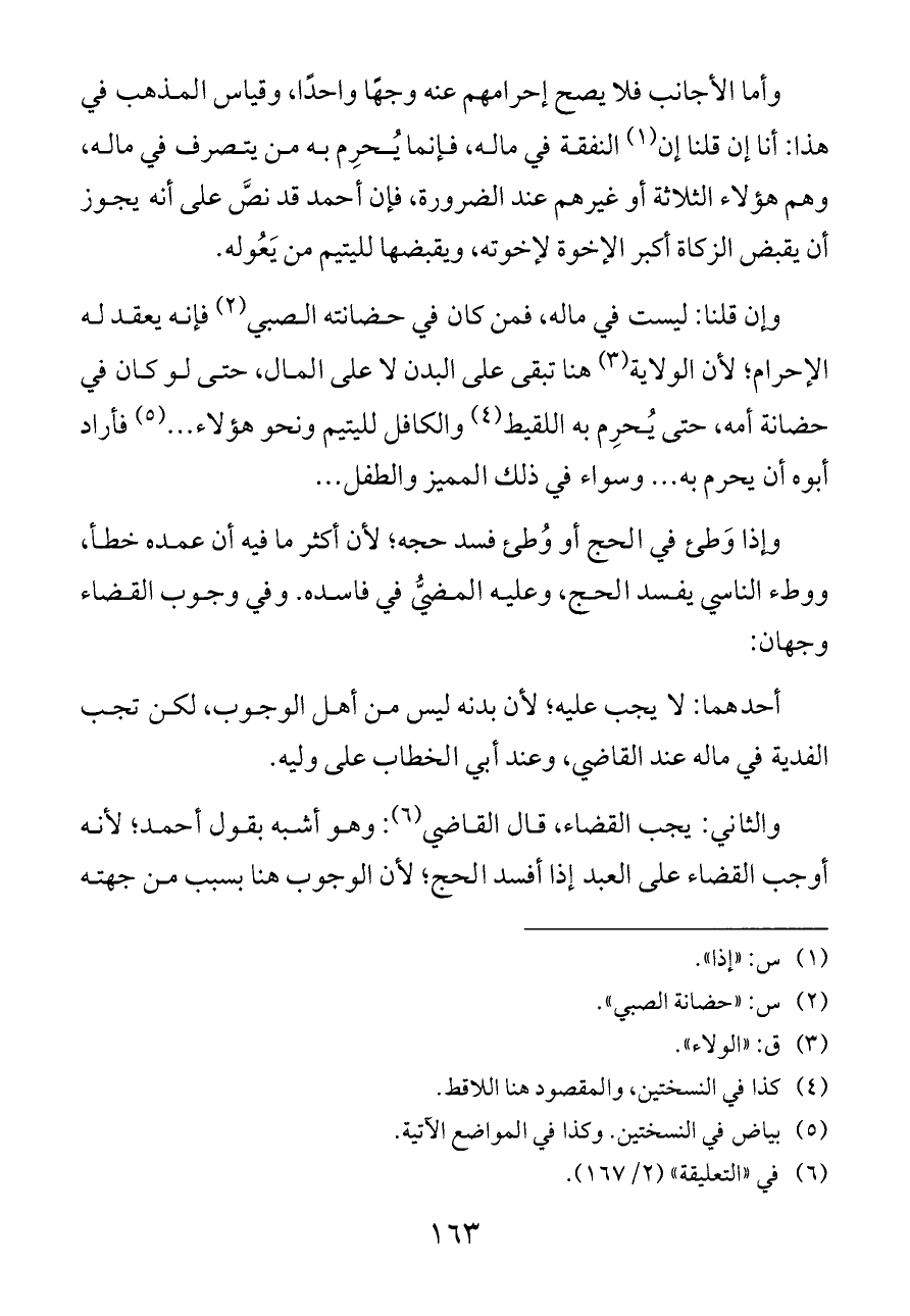وإن قلنا: ليست في ماله، فمن كان في حضانته الصبي (¬٢) فإنه يعقد له الإحرام؛ لأن الولاية (¬٣) هنا تبقى على البدن لا على المال، حتى لو كان في حضانة أمه، حتى يُحرِم به اللقيط (¬٤) والكافل لليتيم ونحو هؤلاء ... (¬٥) فأراد أبوه أن يحرم به ... وسواء في ذلك المميز والطفل ...