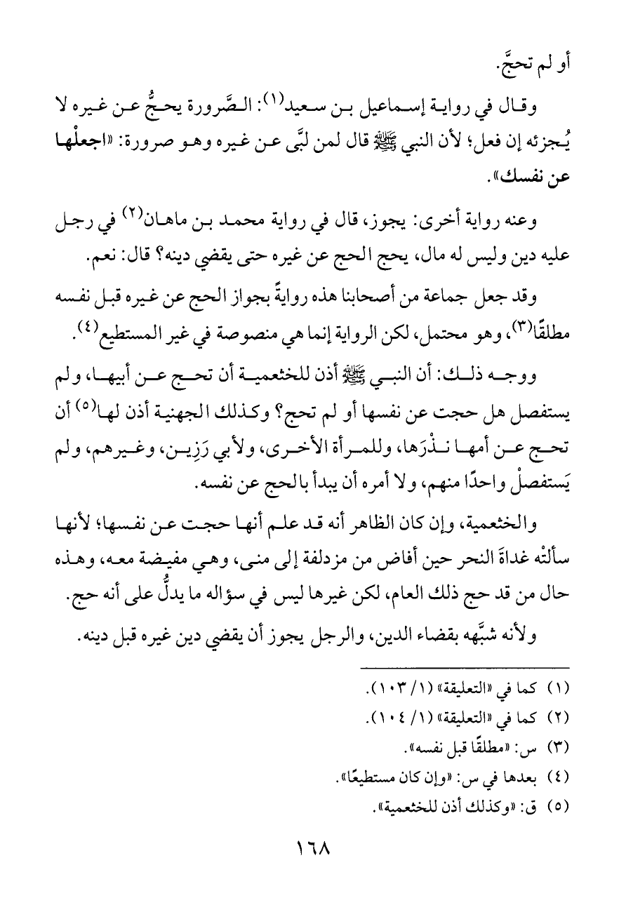 ووجه ذلك: أن النبي - صلى الله عليه وسلم - أذن للخثعمية أن تحج عن أبيها، ولم يستفصل هل حجت عن نفسها أو لم تحج؟ وكذلك الجهنية أذن لها (¬٥) أن تحج عن أمها نذْرَها، وللمرأة الأخرى، ولأبي رَزِين، وغيرهم، ولم يَستفصلْ واحدًا منهم، ولا أمره أن يبدأ بالحج عن نفسه.