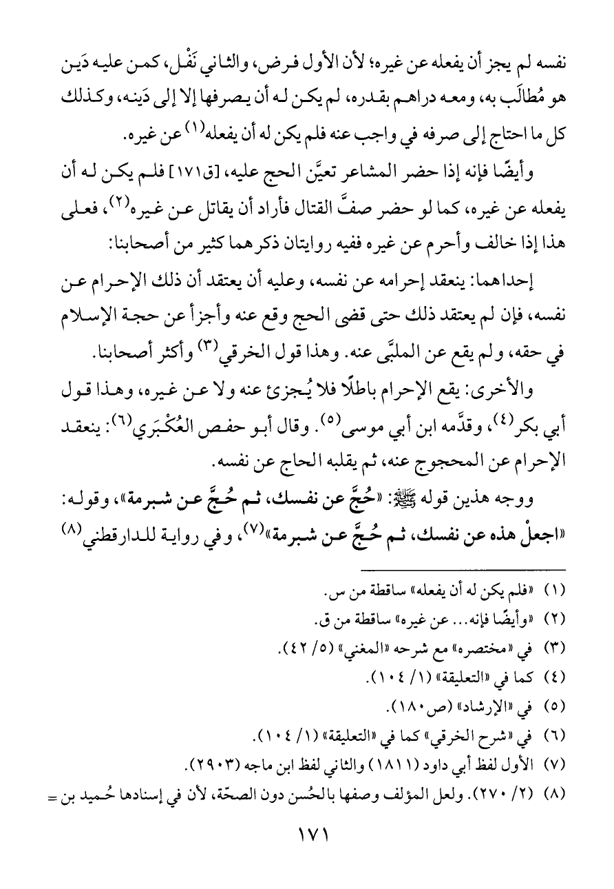 ووجه هذين قوله - صلى الله عليه وسلم -: «حُجَّ عن نفسك، ثم حُجَّ عن شبرمة»، وقوله: «اجعلْ هذه عن نفسك، ثم حُجَّ عن شبرمة» (¬٧)، وفي رواية للدارقطني (¬٨)
