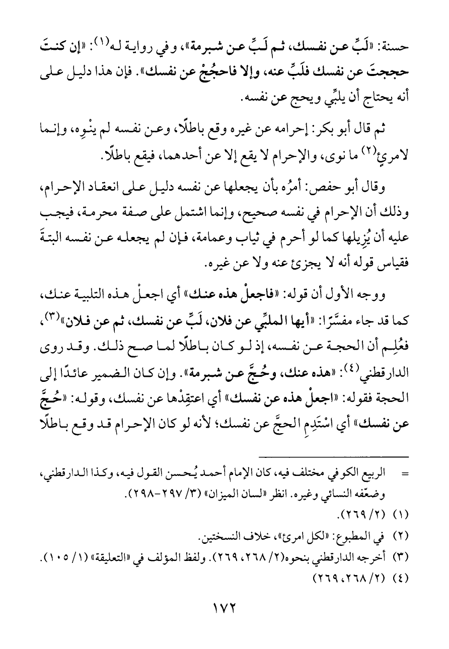 ووجه الأول أن قوله: «فاجعلْ هذه عنك» أي اجعلْ هذه التلبية عنك، كما قد جاء مفسَّرًا: «أيها الملبِّي عن فلان، لَبِّ عن نفسك، ثم عن فلان» (¬٣)، فعُلِم أن الحجة عن نفسه، إذ لو كان باطلًا لما صح ذلك. وقد روى الدارقطني (¬٤): «هذه عنك، وحُجَّ عن شبرمة». وإن كان الضمير عائدًا إلى الحجة فقوله: «اجعلْ هذه عن نفسك» أي اعتقِدْها عن نفسك، وقوله: «حُجَّ عن نفسك» أي اسْتَدِمِ الحجَّ عن نفسك؛ لأنه لو كان الإحرام قد وقع باطلًا