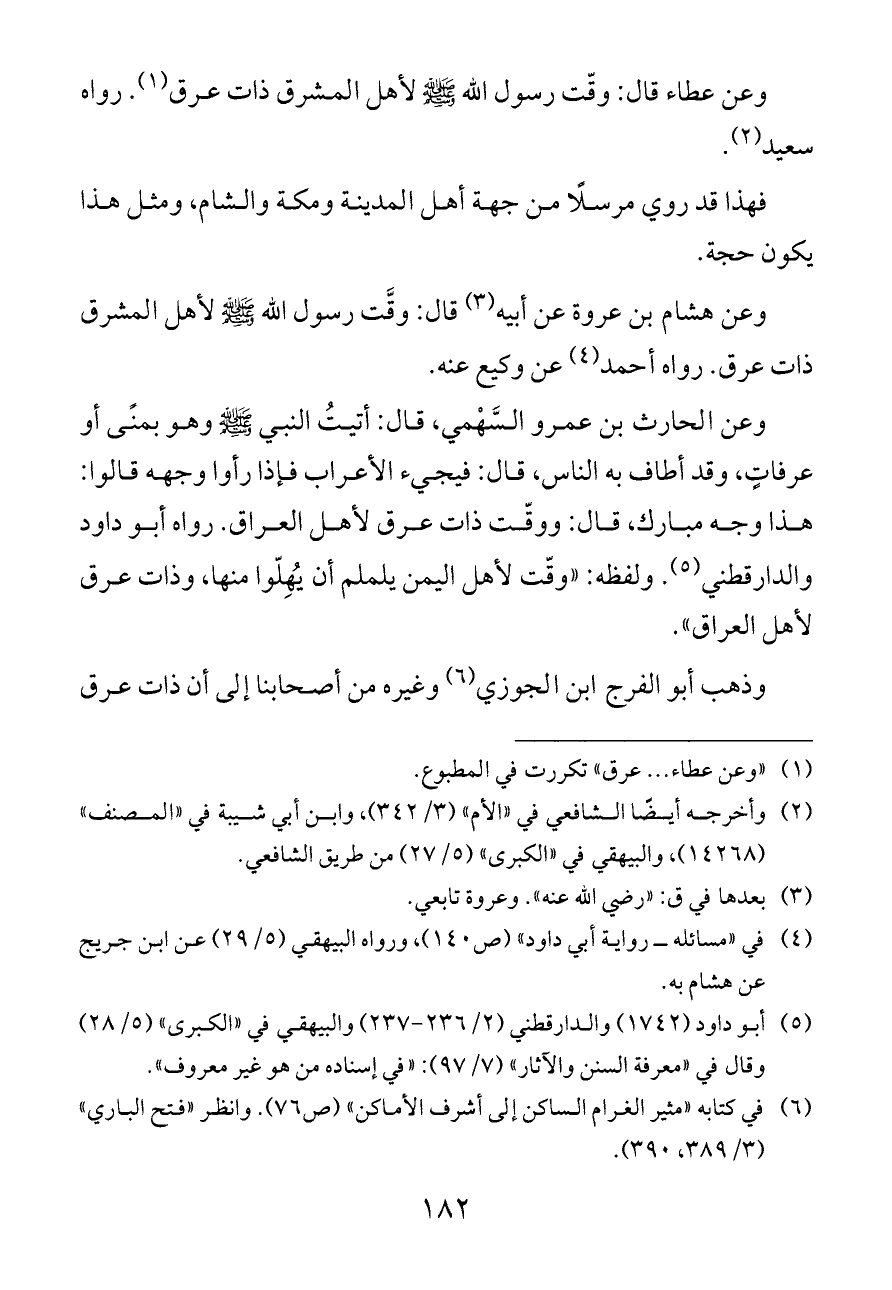 وعن هشام بن عروة عن أبيه (¬٤) قال: وقَّت رسول الله - صلى الله عليه وسلم - لأهل المشرق ذات عرق. رواه أحمد (¬٥) عن وكيع عنه.