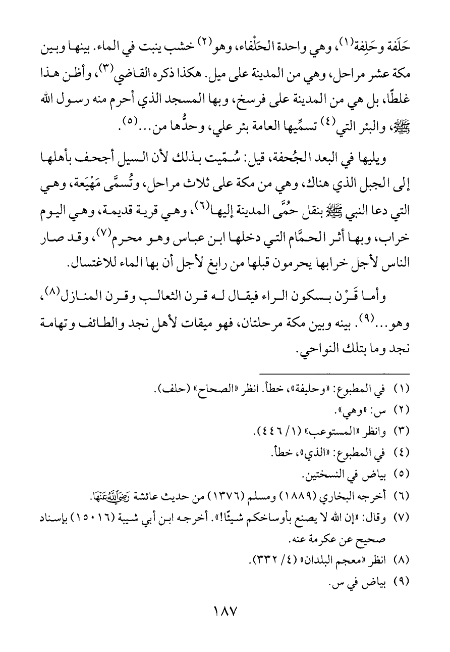 حَلَفة وحَلِفة (¬١)، وهي واحدة الحَلْفاء، وهو (¬٢) خشب ينبت في الماء. بينها وبين مكة عشر مراحل، وهي من المدينة على ميل. هكذا ذكره القاضي (¬٣)، وأظن هذا غلطًا، بل هي من المدينة على فرسخ، وبها المسجد الذي أحرم منه رسول الله - صلى الله عليه وسلم -، والبئر التي (¬٤) تسمِّيها العامة بئر علي، وحدُّها من ... (¬٥).