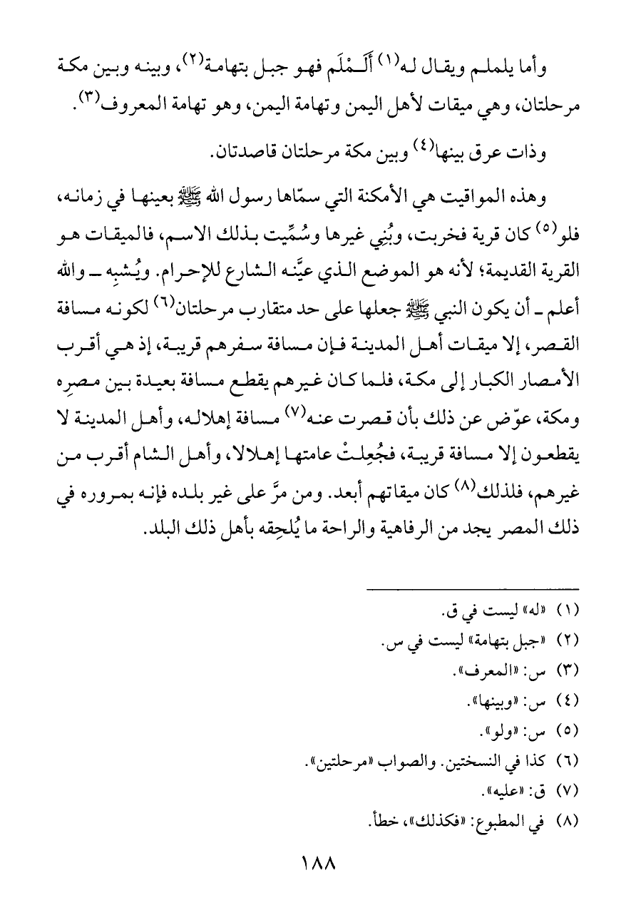 وهذه المواقيت هي الأمكنة التي سمّاها رسول الله - صلى الله عليه وسلم - بعينها في زمانه، فلو (¬٥) كان قرية فخربت، وبُنِي غيرها وسُمِّيت بذلك الاسم، فالميقات هو القرية القديمة؛ لأنه هو الموضع الذي عيَّنه الشارع للإحرام. ويُشبِه ــ والله أعلم ــ أن يكون النبي - صلى الله عليه وسلم - جعلها على حد متقارب مرحلتان (¬٦) لكونه مسافة القصر، إلا ميقات أهل المدينة فإن مسافة سفرهم قريبة، إذ هي أقرب الأمصار الكبار إلى مكة، فلما كان غيرهم يقطع مسافة بعيدة بين مصرِه ومكة، عوّض عن ذلك بأن قصرت عنه (¬٧) مسافة إهلاله، وأهل المدينة لا يقطعون إلا مسافة قريبة، فجُعِلتْ عامتها إهلالا، وأهل الشام أقرب من غيرهم، فلذلك (¬٨) كان ميقاتهم أبعد. ومن مرَّ على غير بلده فإنه بمروره في ذلك المصر يجد من الرفاهية والراحة ما يُلحِقه بأهل ذلك البلد.