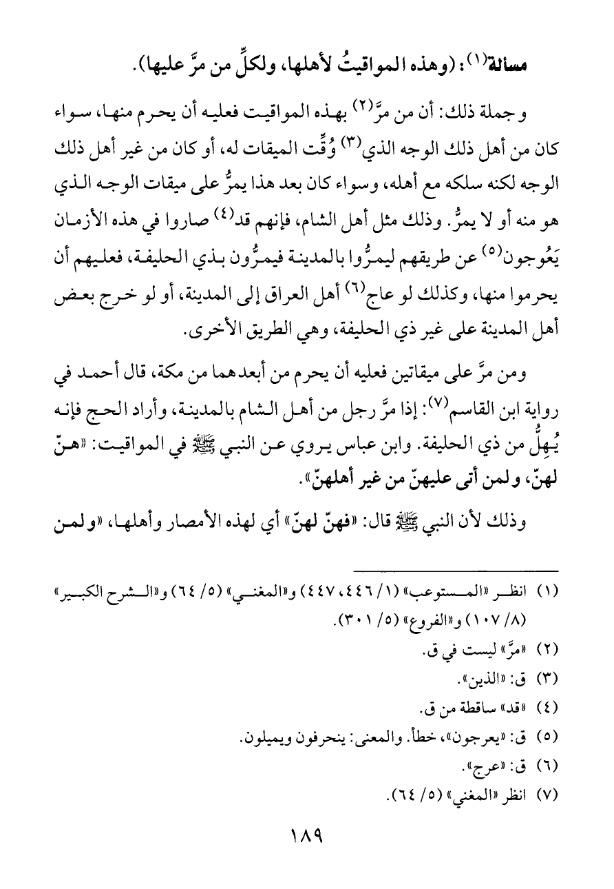 وجملة ذلك: أن من مرَّ (¬٢) بهذه المواقيت فعليه أن يحرم منها، سواء كان من أهل ذلك الوجه الذي (¬٣) وُقِّت الميقات له، أو كان من غير أهل ذلك الوجه لكنه سلكه مع أهله، وسواء كان بعد هذا يمرُّ على ميقات الوجه الذي هو منه أو لا يمرُّ. وذلك مثل أهل الشام، فإنهم قد (¬٤) صاروا في هذه الأزمان يَعُوجون (¬٥) عن طريقهم ليمرُّوا بالمدينة فيمرُّون بذي الحليفة، فعليهم أن يحرموا منها، وكذلك لو عاج (¬٦) أهل العراق إلى المدينة، أو لو خرج بعض أهل المدينة على غير ذي الحليفة، وهي الطريق الأخرى.