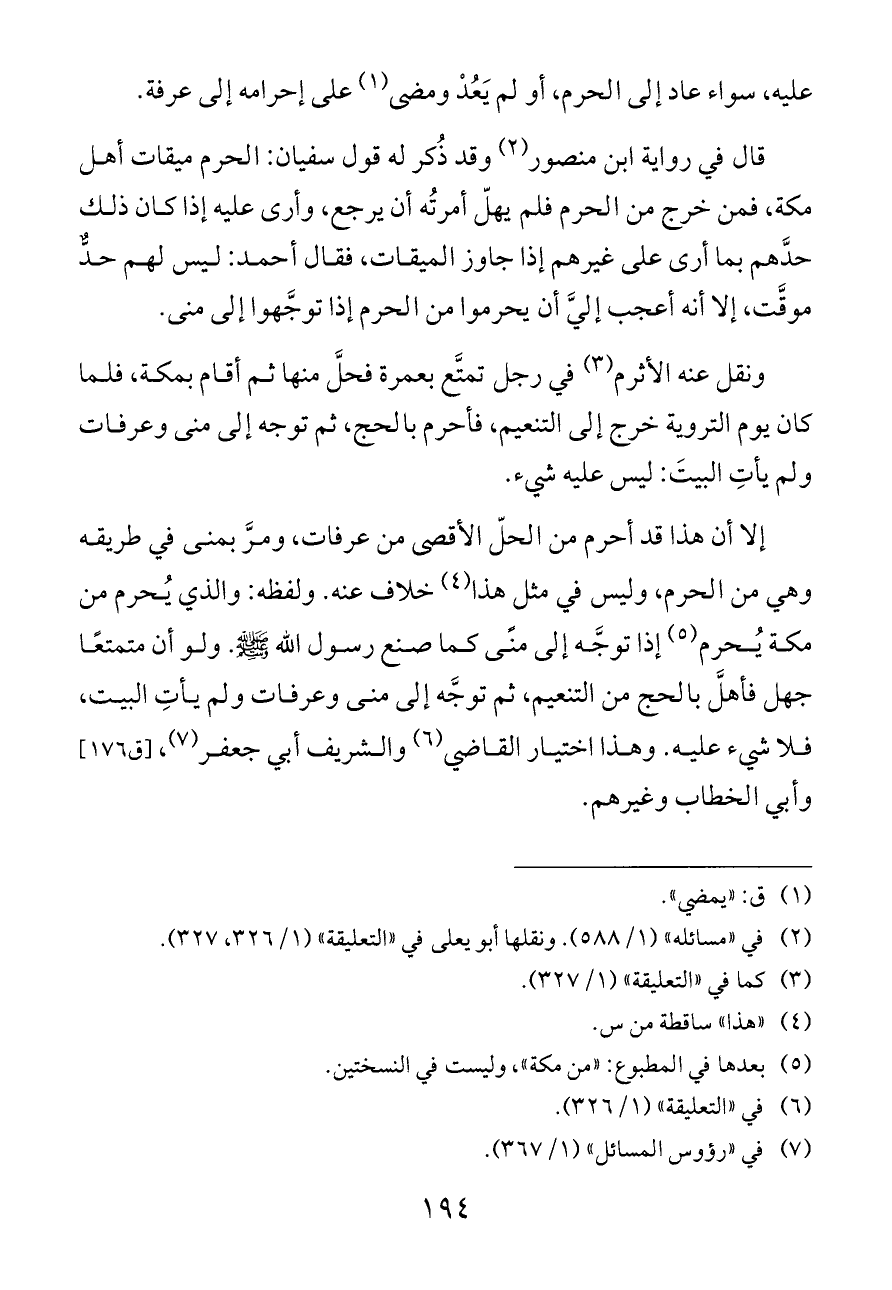 قال في رواية ابن منصور (¬٢) وقد ذُكر له قول سفيان: الحرم ميقات أهل مكة، فمن خرج من الحرم فلم يهلّ أمرتُه أن يرجع، وأرى عليه إذا كان ذلك حدَّهم بما أرى على غيرهم إذا جاوز الميقات، فقال أحمد: ليس لهم حدٌّ موقَّت، إلا أنه أعجب إليَّ أن يحرموا من الحرم إذا توجَّهوا إلى منى.