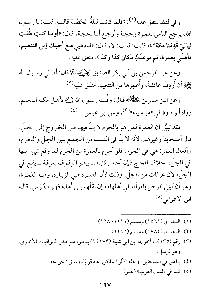 فقد تبيَّن أن العمرة لمن هو بالحرم لا بدَّ فيها من الخروج إلى الحلّ. قال أصحابنا وغيرهم: لأنه لا بدَّ في النسك من الجمع بين الحِلّ والحرم، وأفعال العمرة هي في الحرم، فلو أحرم بالعمرة من الحرم لما وقع شيء منها في الحِلّ، بخلاف الحج فإن أحد ركنيه ــ وهو الوقوف بعرفة ــ يقع في الحِلّ، لأن عرفات من الحِلّ، وذلك لأن العمرة هي الزيارة، ومنه العُمْرة، وهو أن يَبنِيَ الرجل بامرأته في أهلها، فإن نقَلَها إلى أهله فهو العُرْس. قاله ابن الأعرابي (¬٥).