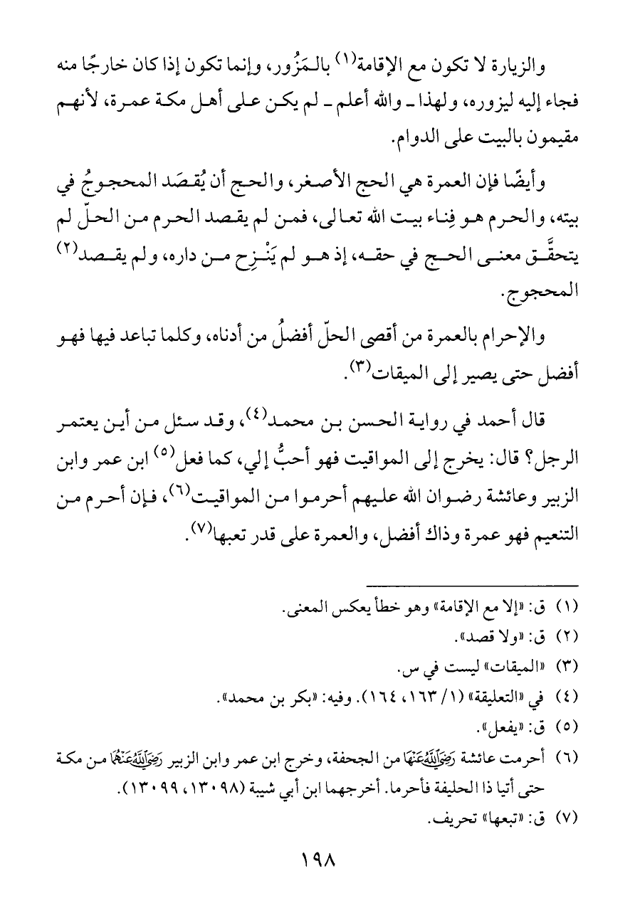 والزيارة لا تكون مع الإقامة (¬١) بالمَزُور، وإنما تكون إذا كان خارجًا منه فجاء إليه ليزوره، ولهذا ــ والله أعلم ــ لم يكن على أهل مكة عمرة، لأنهم مقيمون بالبيت على الدوام.