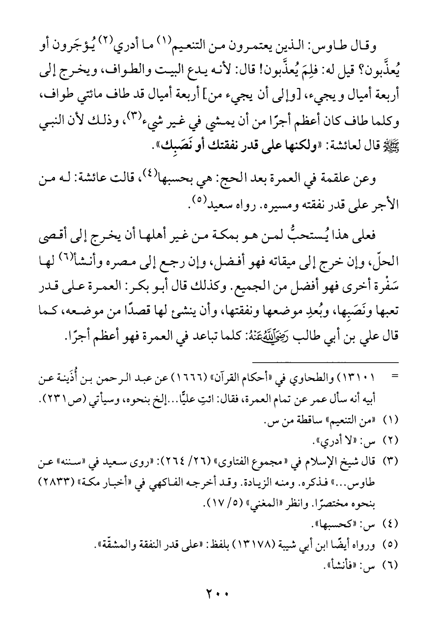 وقال طاوس: الذين يعتمرون من التنعيم (¬١) ما أدري (¬٢) يُؤجَرون أو يُعذَّبون؟ قيل له: فلِمَ يُعذَّبون! قال: لأنه يدع البيت والطواف، ويخرج إلى أربعة أميال ويجيء، [وإلى أن يجيء من] أربعة أميال قد طاف مائتي طواف، وكلما طاف كان أعظم أجرًا من أن يمشي في غير شيء (¬٣)، وذلك لأن النبي - صلى الله عليه وسلم - قال لعائشة: «ولكنها على قدر نفقتك أو نَصَبِك».