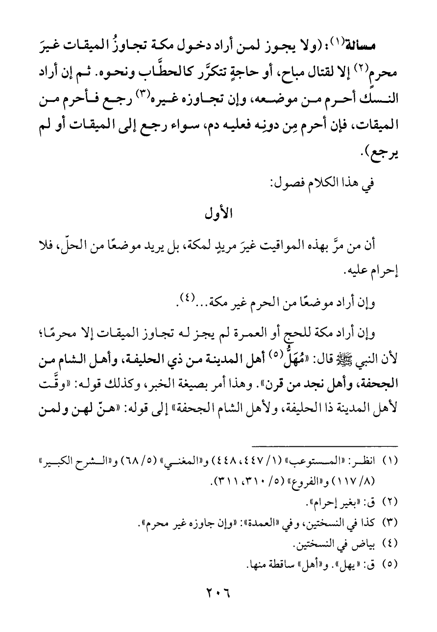 وإن أراد مكة للحج أو العمرة لم يجز له تجاوز الميقات إلا محرمًا؛ لأن النبي - صلى الله عليه وسلم - قال: «مُهَلُّ (¬٥) أهل المدينة من ذي الحليفة، وأهل الشام من الجحفة، وأهل نجد من قرن». وهذا أمر بصيغة الخبر، وكذلك قوله: «وقَّت لأهل المدينة ذا الحليفة، ولأهل الشام الجحفة» إلى قوله: «هنّ لهن ولمن