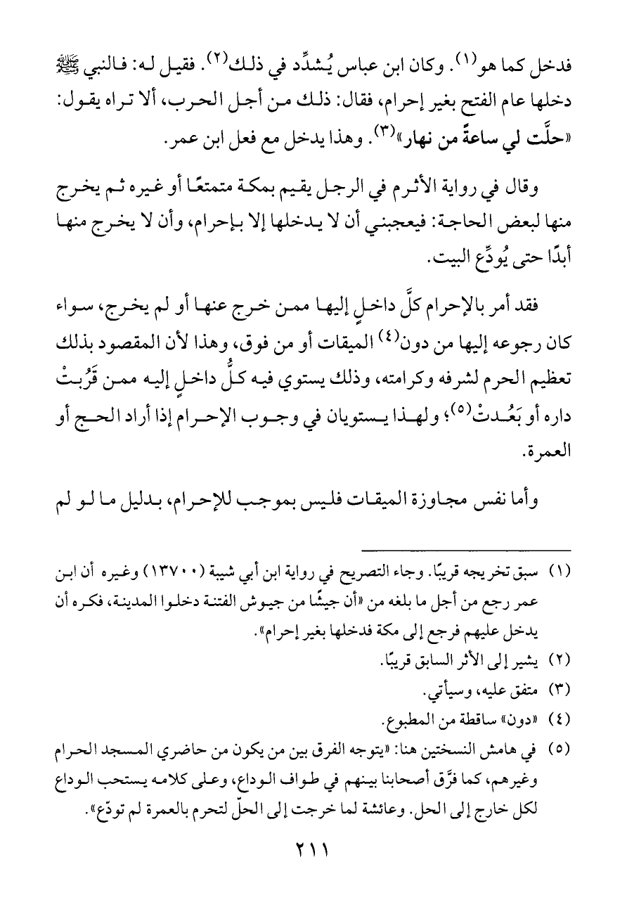 فدخل كما هو (¬١). وكان ابن عباس يُشدِّد في ذلك (¬٢). فقيل له: فالنبي - صلى الله عليه وسلم - دخلها عام الفتح بغير إحرام، فقال: ذلك من أجل الحرب، ألا تراه يقول: «حلَّت لي ساعةً من نهار» (¬٣). وهذا يدخل مع فعل ابن عمر.